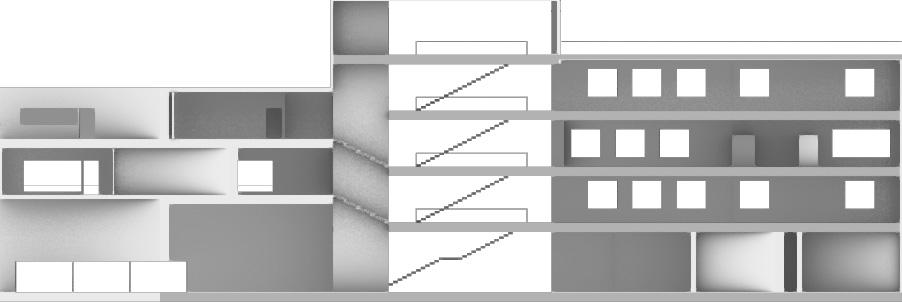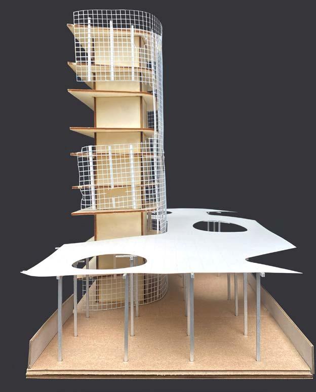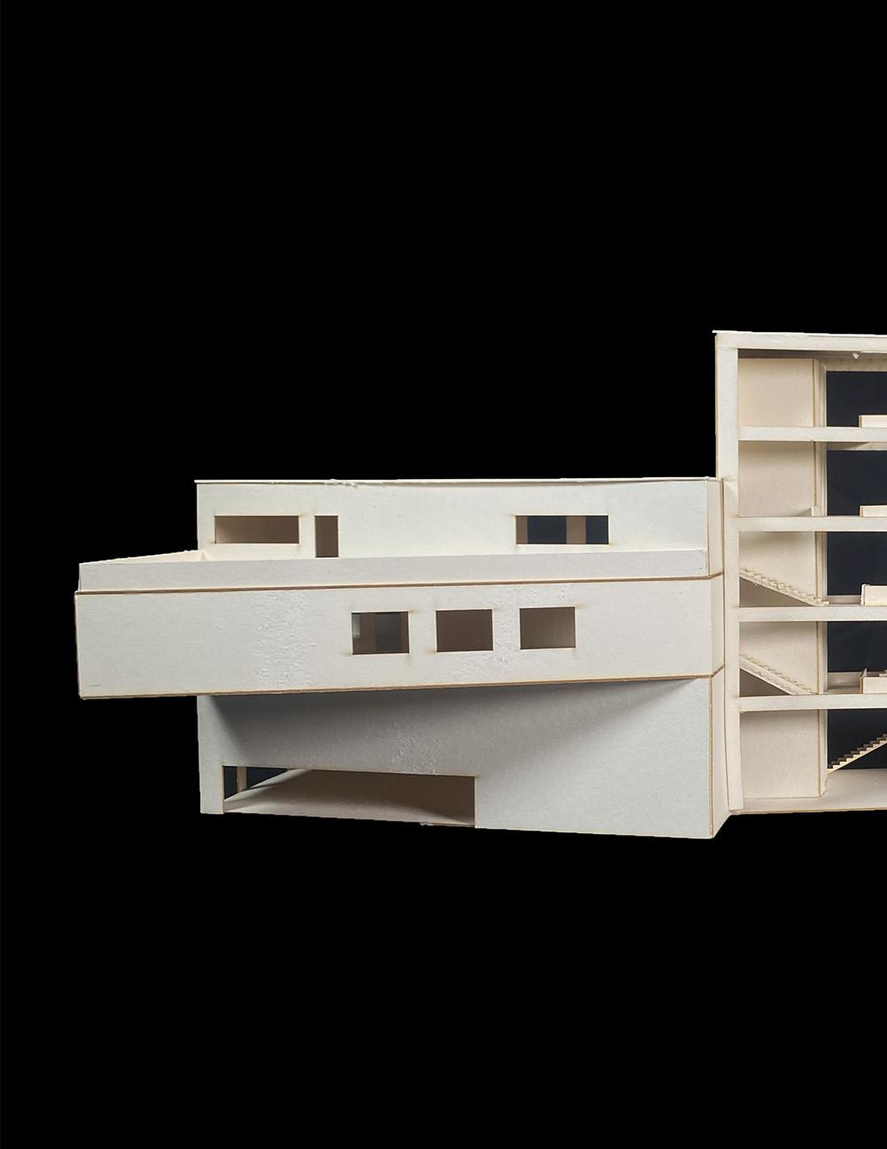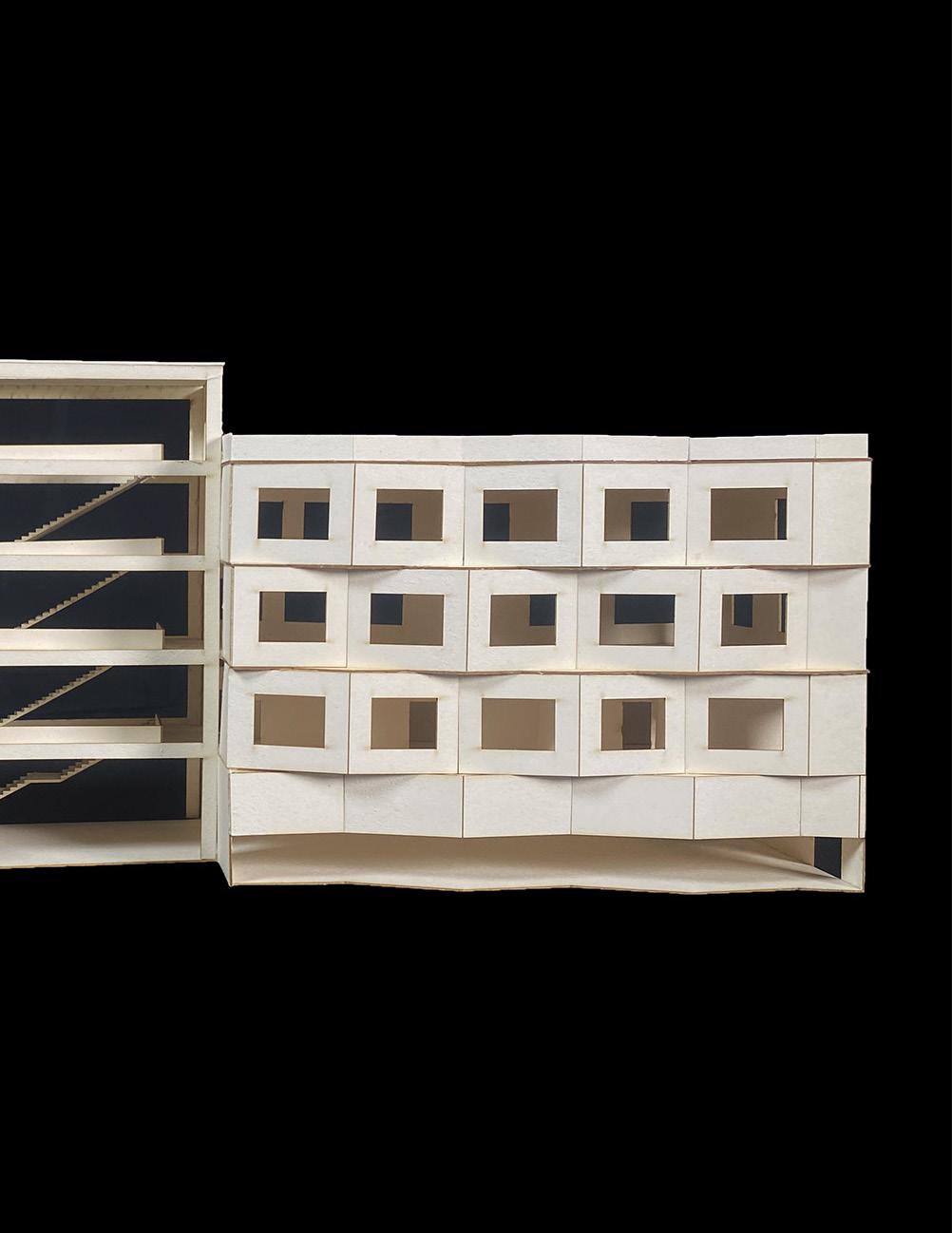 The building was developed from a series of geometries that directly respond to the Armory square site, specifically the wall of the neighboring building and the creek walk. It consists of three volumes that define the building in both plan and section. The first volume with the entrance is mainly reserved for larger public spaces— including the lobby, library, gallery, and an outdoor balconies that capture views of the creek below. The opposite side of the hostel contains the majority of the residence spaces and private areas, including single bedrooms, 6-person dorms, bathrooms, and small lounges. The middle atrium is essentially a glass box— entirely reserved for circulation, that connects the public areas to the private ones and brings light to the space. The mirroring geometries throughout the building reflects the function of the volumes as residences and public spaces, while also attempting to frame views on both sides of the hostel and ultimately create the building’s facade.