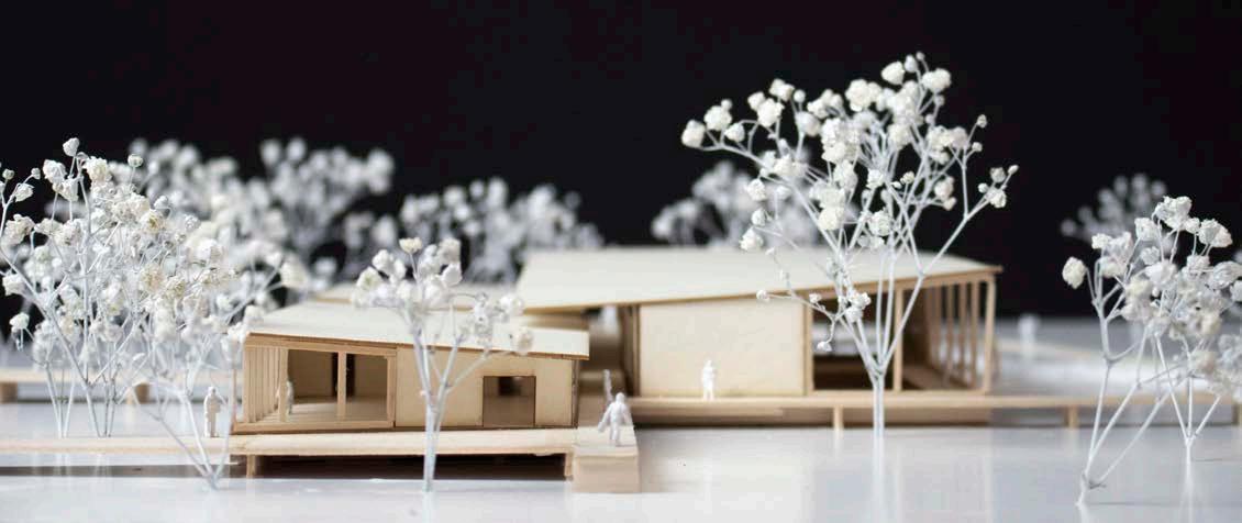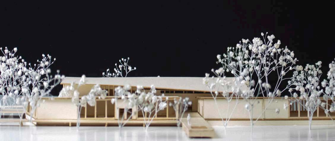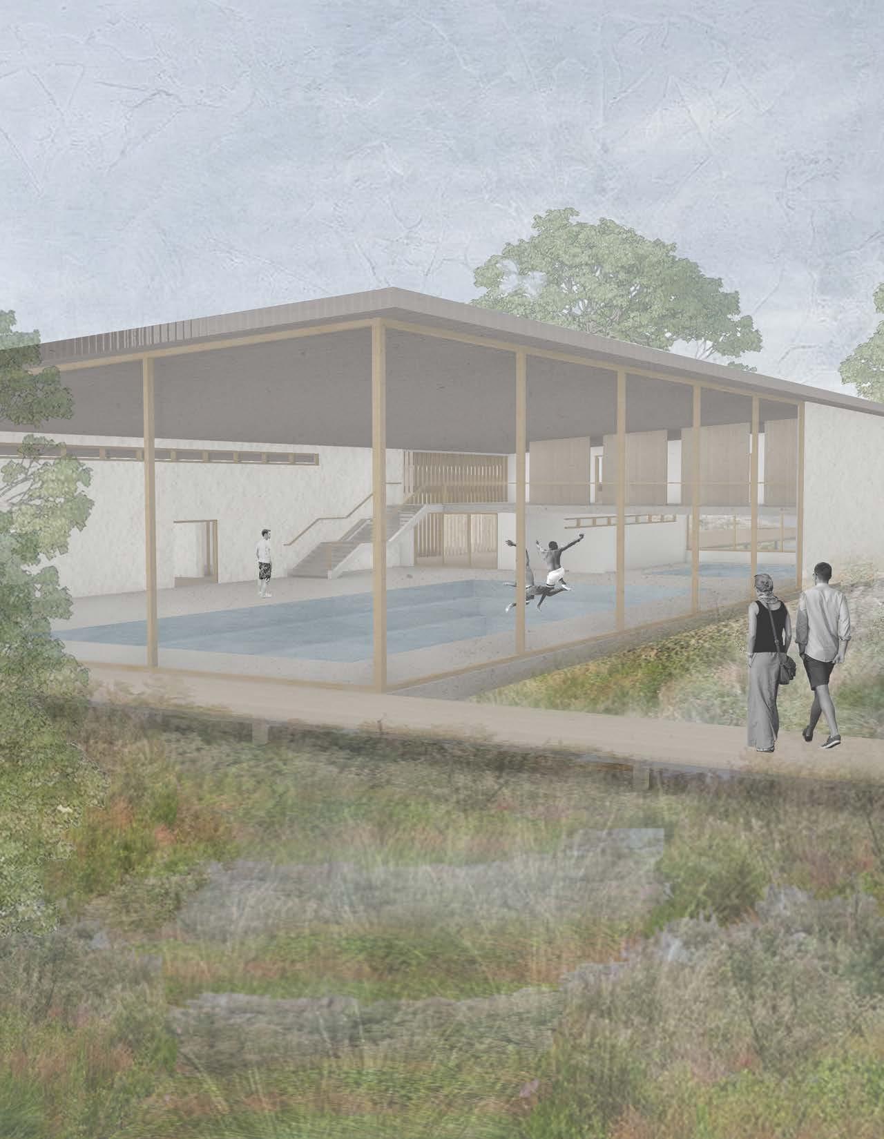 This project is a community wellness center with the main program of a bathhouse, that immerses visitors into the surrounding environment, while preserving the native plants and ecosystems in Clay. The building is made up of three main volumes-- the largest of which contains the temperate pool-- but there is also a series of more intimate baths at different temperatures. The slant of the roof directs focus to large windows, which look directly out to the gardens, pond and surrounding forest.