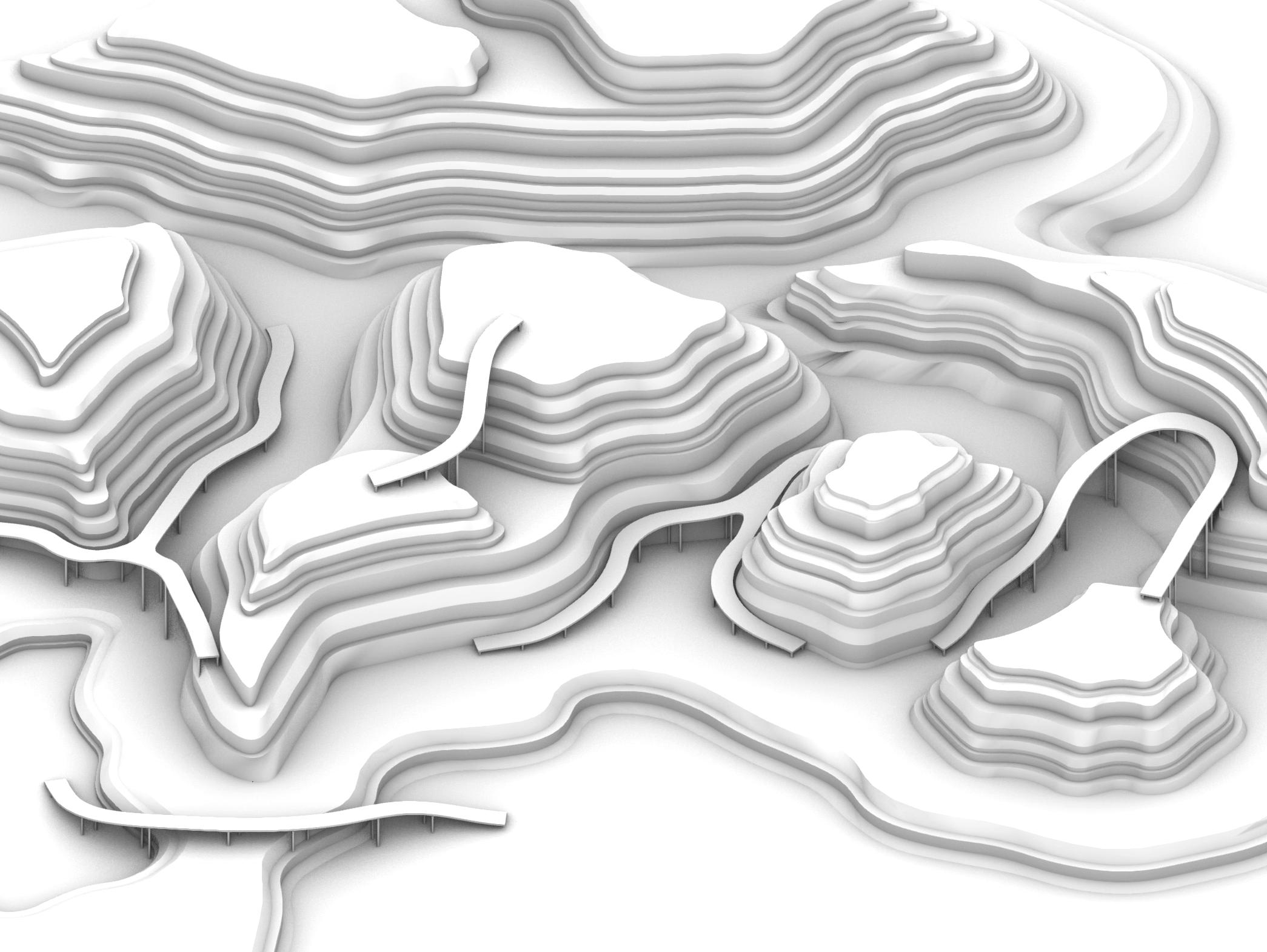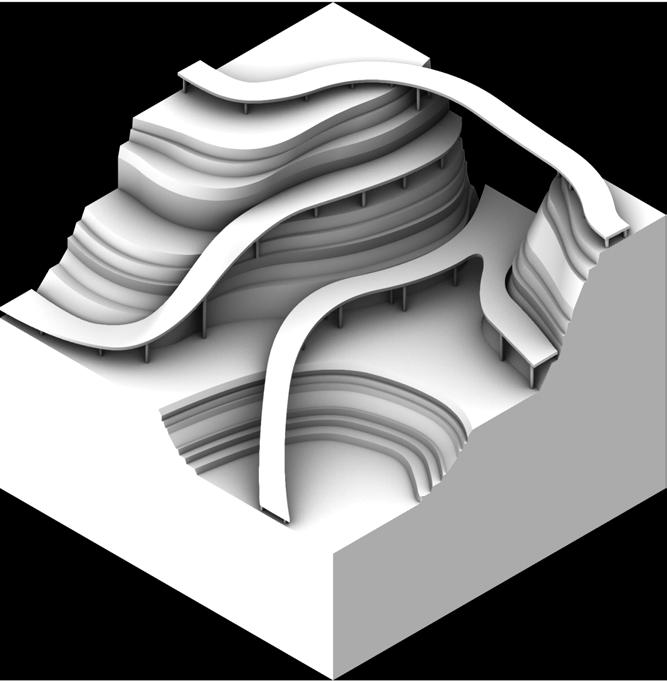 This project hybridizes a system of intervention, and its interaction with the ground. While the ground I designed is unique, it takes inspiration from the canyon landform, through striation and spread to create layers and gaps in the topography. The ramps can be seen as an extension of the ground, which aim to maintain continuity across the landscape. The ramp typologies investigate hypothetical modes of circulation across the manipulated ground.