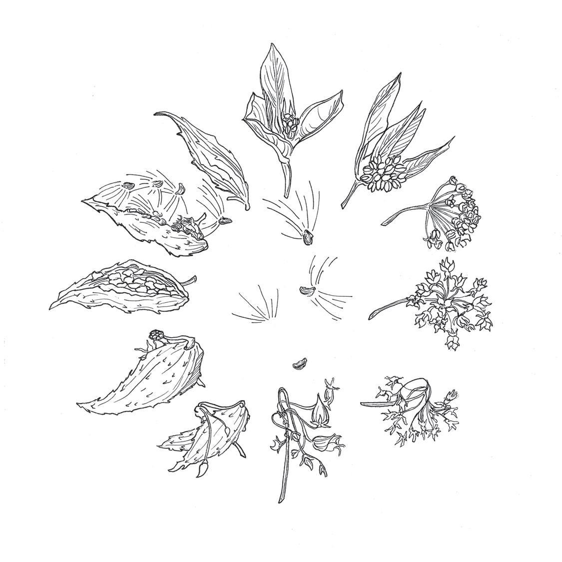 The common milkweed plant is native to the Wilderness Retreat site in Clay, NY. These diagrams depict the plant’s life cycle, relationship to wind, annual behavior, and interaction with other species. The milkweed garden in the bathhouse project will become a space for monarch butterflies to flourish in the summer months, which are essential for pollination.