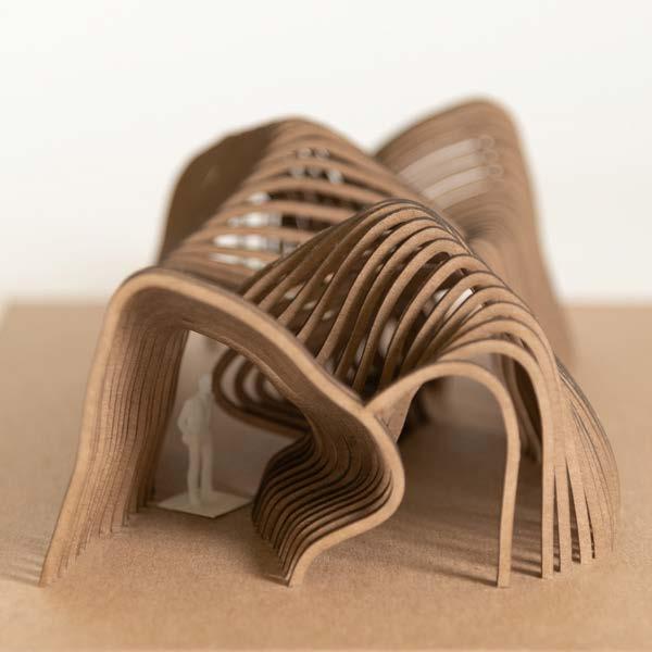 I referred back to the precedent study of the Koyasan Guest House, and its linear frame structure, which I used as the basis for this design. I transformed the frame to accommodate a collective body, and then translated the idea of communal and private space through its expansion and compression. The initial shapes used to define the structure were derived from the spatial envelope of a single body undergoing two separate motions.