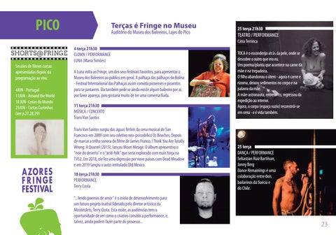 4 terça 21h30 CLOWN / PERFORMANCE LUNA (Maria Simões) A Luna volta ao Fringe, um dos seus festivais favoritos, para apresentar o Museu dos Baleeiros ao público em geral. A palhaça das palhaças do Bolina - Festival Internacional das Palhaças assim convida picoenses e picarotos para se juntarem. Ela também pede se ainda existe algum baleeiro por aí, por favor apareça, pois gostaria muito de ter uma conversa fiada. 11 terça 21h30 MÚSICA / CONCERTO Trans Van Santos Trans Van Santos surgiu das águas férteis da cena musical de San Francisco em 2009 com seu coletivo neo-psicodélico Os Beaches, Depois de marcar a trilha sonora do filme de James Franco, I Think You Are Totally Wrong: A Quarrel (2015), lançou Moon Mirage. O álbum apresentou o “noir do deserto” e o “acid-folk” que seria explorado com mais força na TVS2. Em 2018, ele fez uma digressão por nove países com Dead Meadow e em 2019 lançou o auto-intitulado Old Mexico. 18 terça 21h30 PERFORMANCE Terry Costa "...lendo poemas de amor" é o início de desenvolvimento para um futuro projeto teatral liderado pelo diretor artístico da MiratecArts, Terry Costa. Esta noite, as audiências tem a oportunidade de ver como o criativo constrói a performance, e, talvez, ainda podem fazer parte do processo...