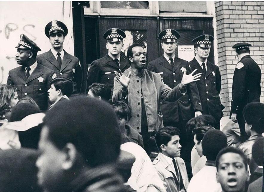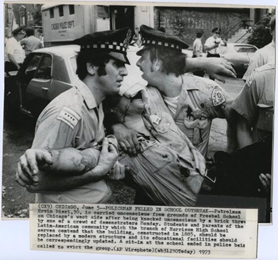 Injured police officer that was hit on the face with brick by protesters. The Defender quoted a 9th grader who said she was marching to save Froebel because they did not want to have to go to school with black people. This is reportedly the protest that led to the construction of Benito Juarez High School