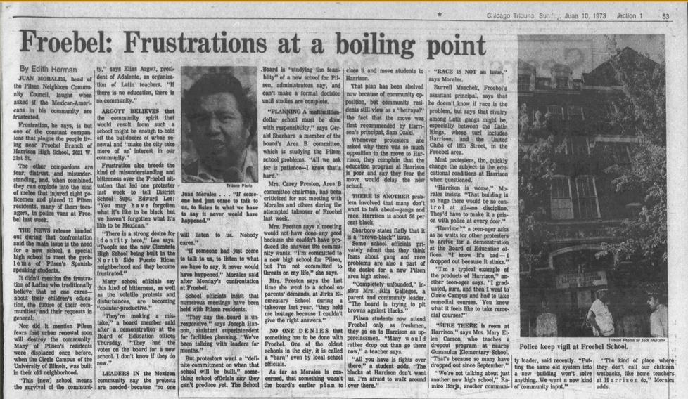 This newspaper clippping highlights the hopes and fears of Pilsen residents about the possible construction of Benito Juarez High School and demolition of Froebel High School.