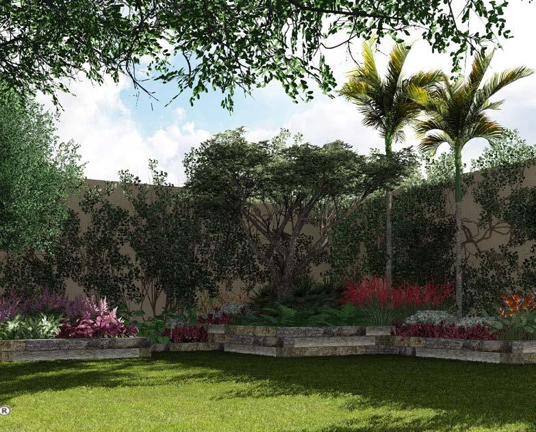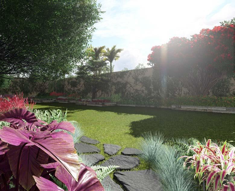 Selected colorful tropical vegetation, placing sun-loving species in open areas and shade plants near the building.