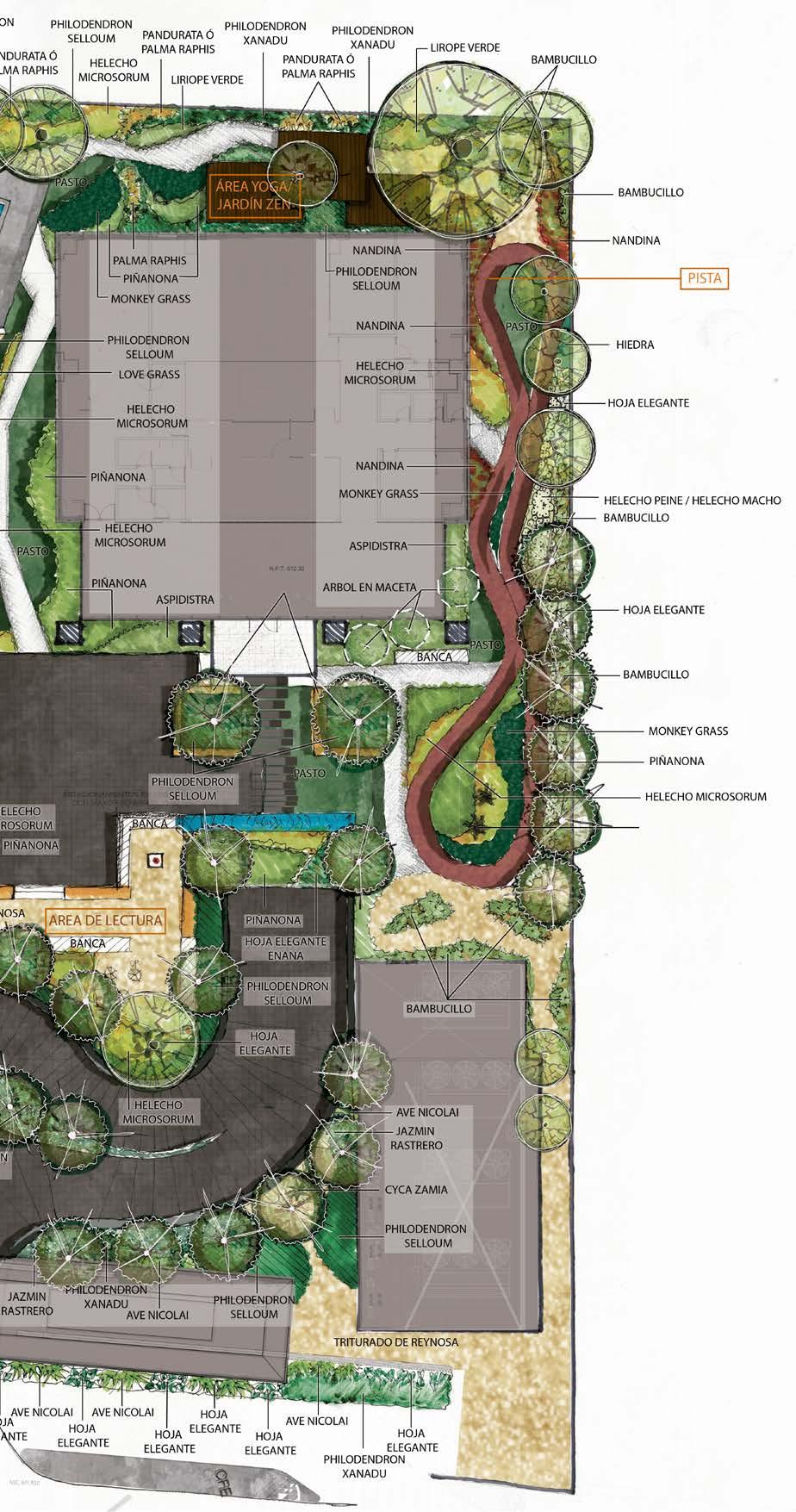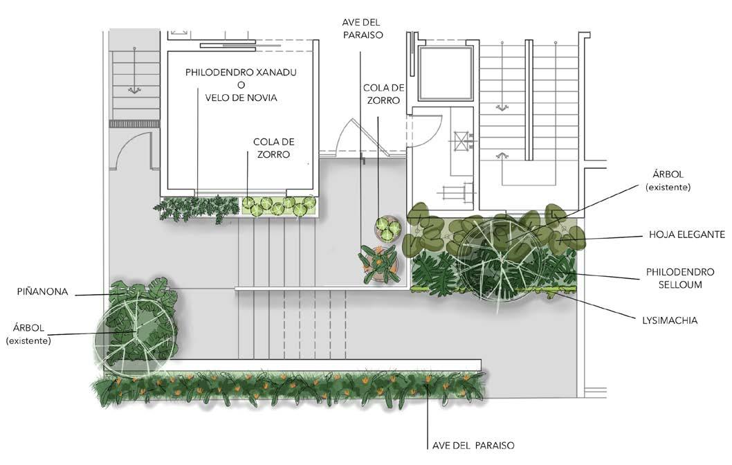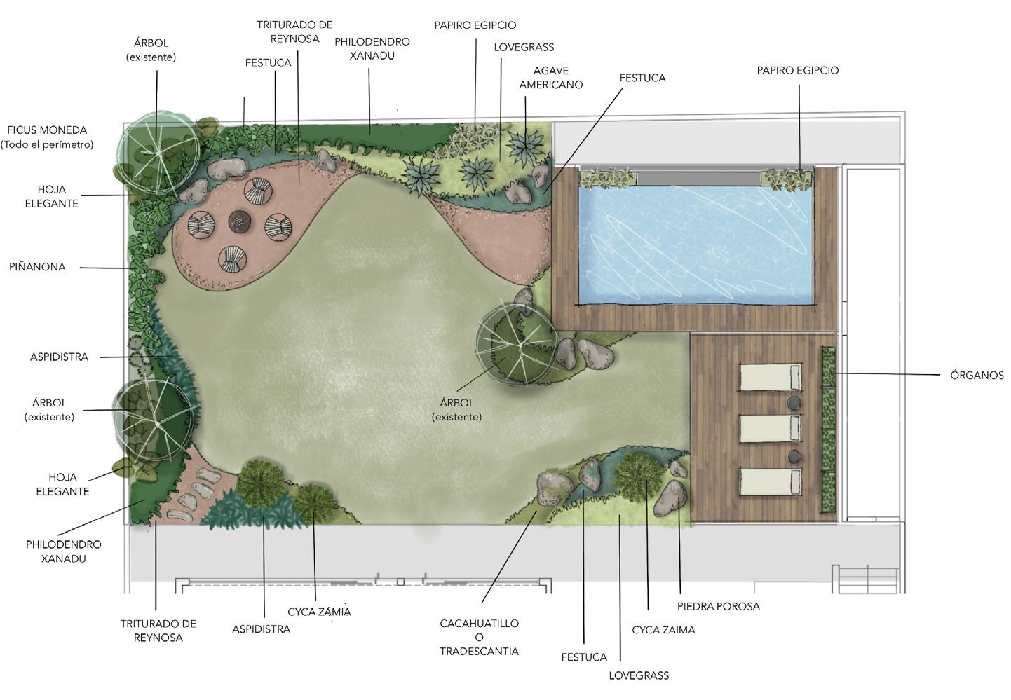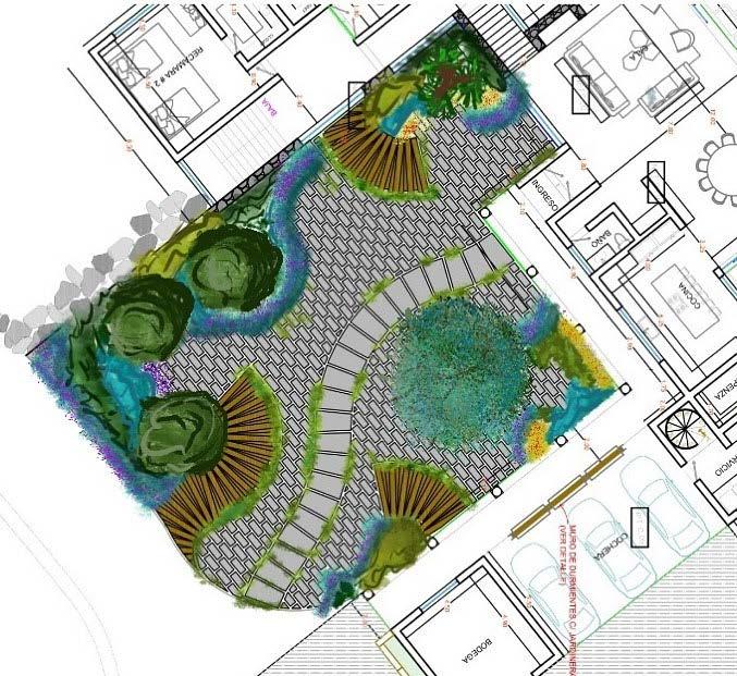 Para la propuesta de jardinería Garden proposal in “humid forest” style with vegetation in yellow, blue, and green tones.