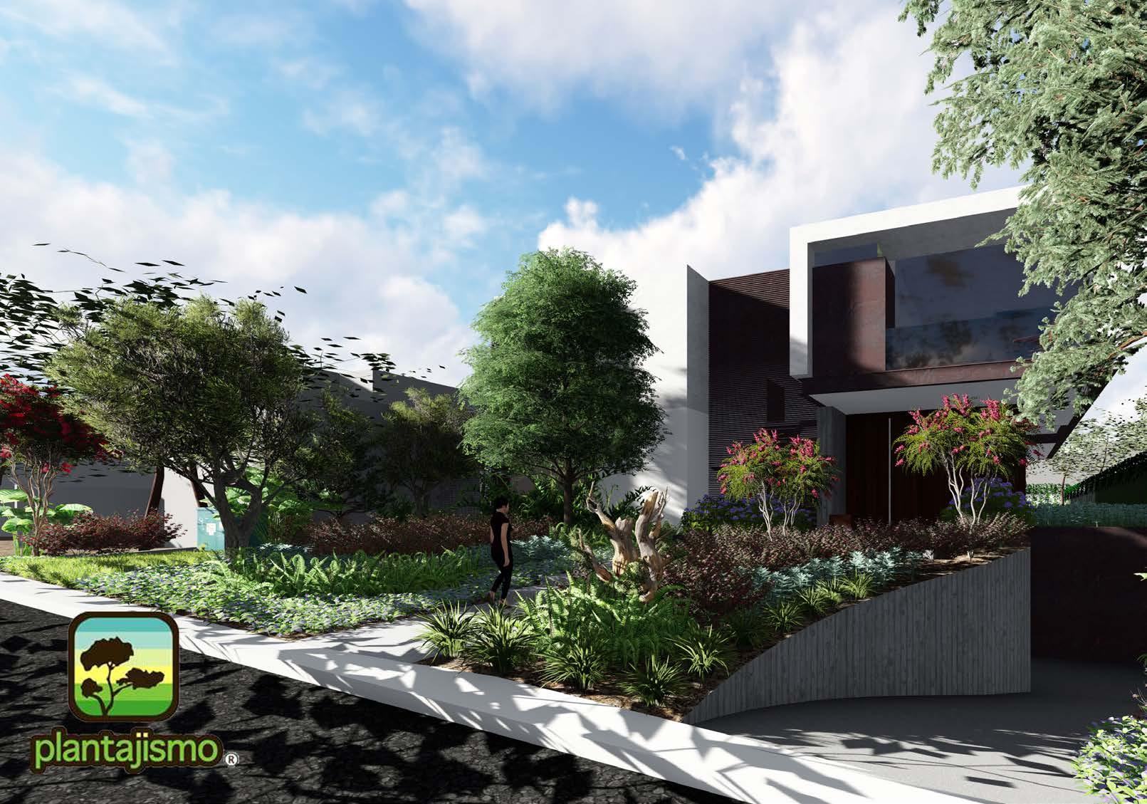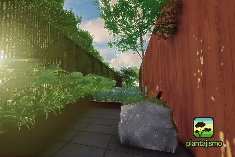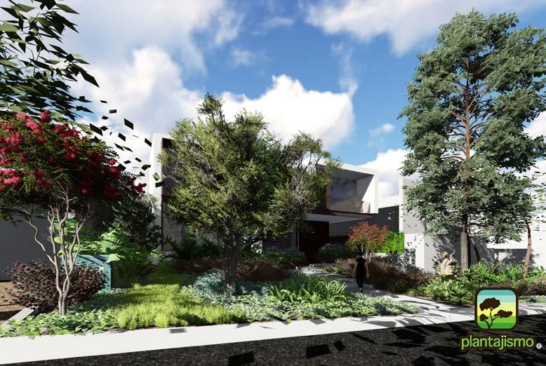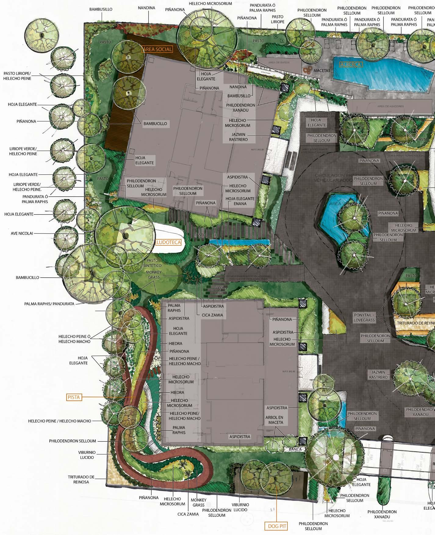 Para la propuesta de jardinería Garden proposal in “humid forest” style with vegetation in yellow, blue, and green tones.