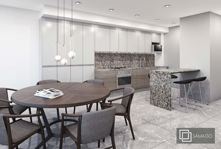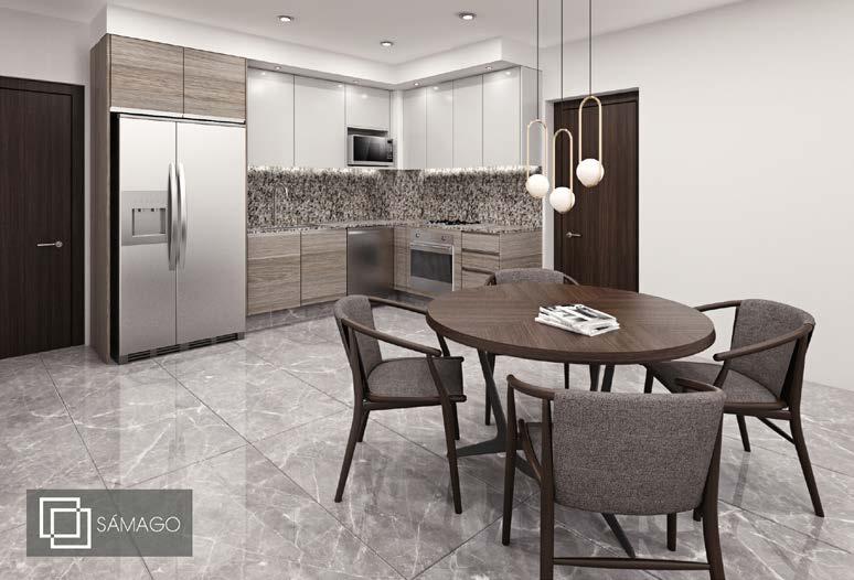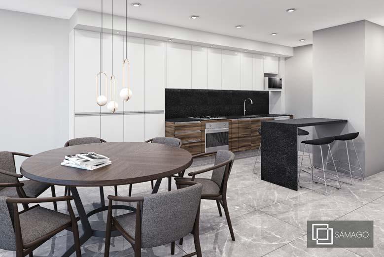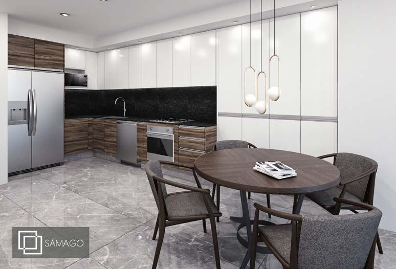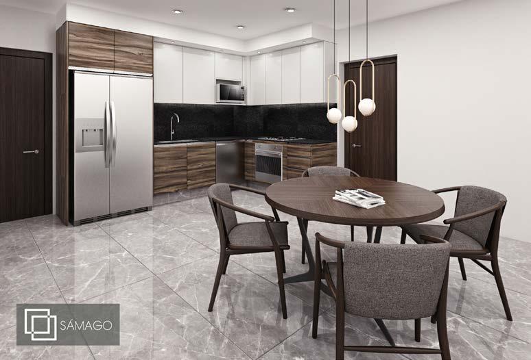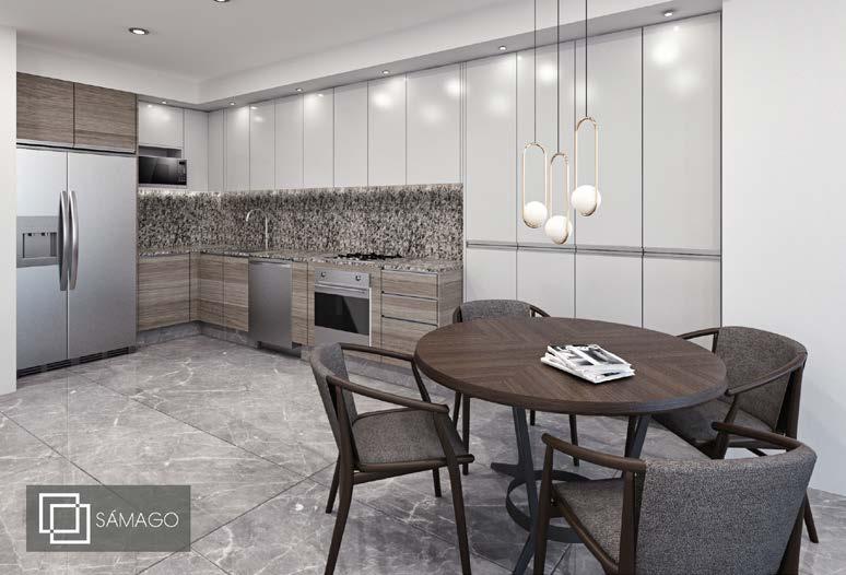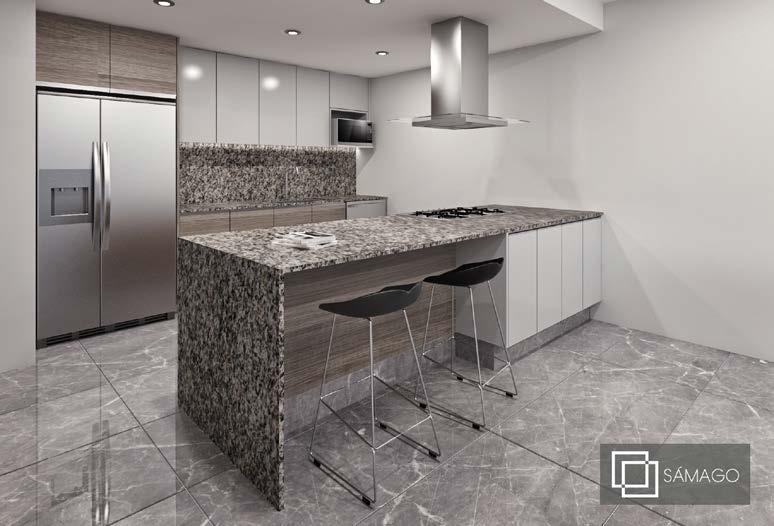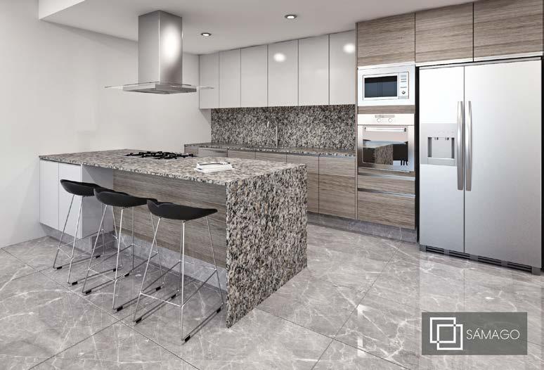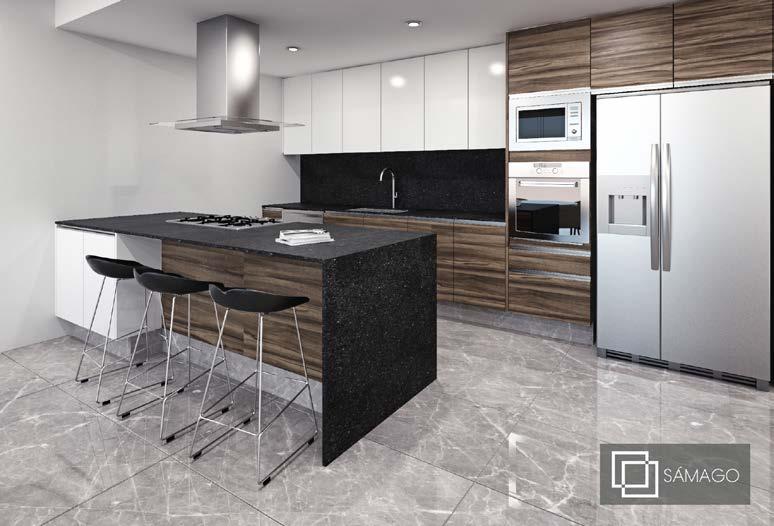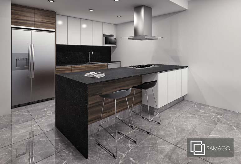 For the Roof Garden in the owner’s apartment, high-end finishes were selected, such as imported melamine “Olmo Antiguo” and “Humo Satinado,” combined with black granite and grey quartz countertops for harmony with the rest of the project.