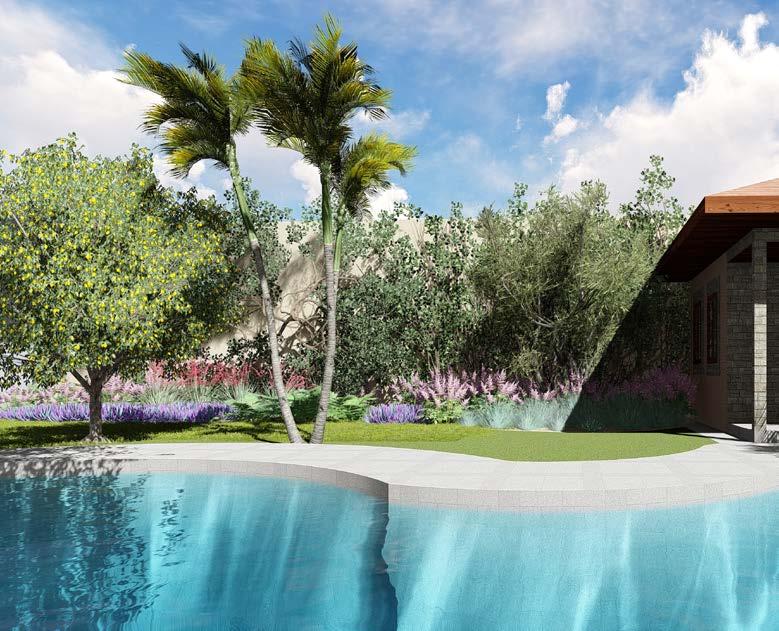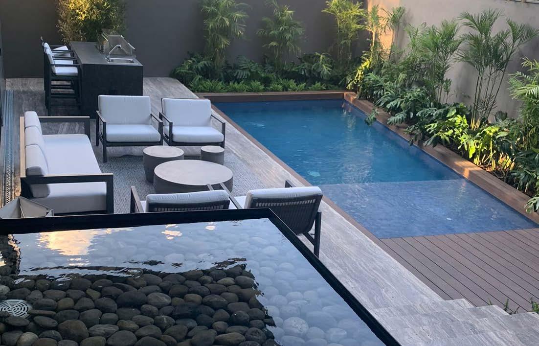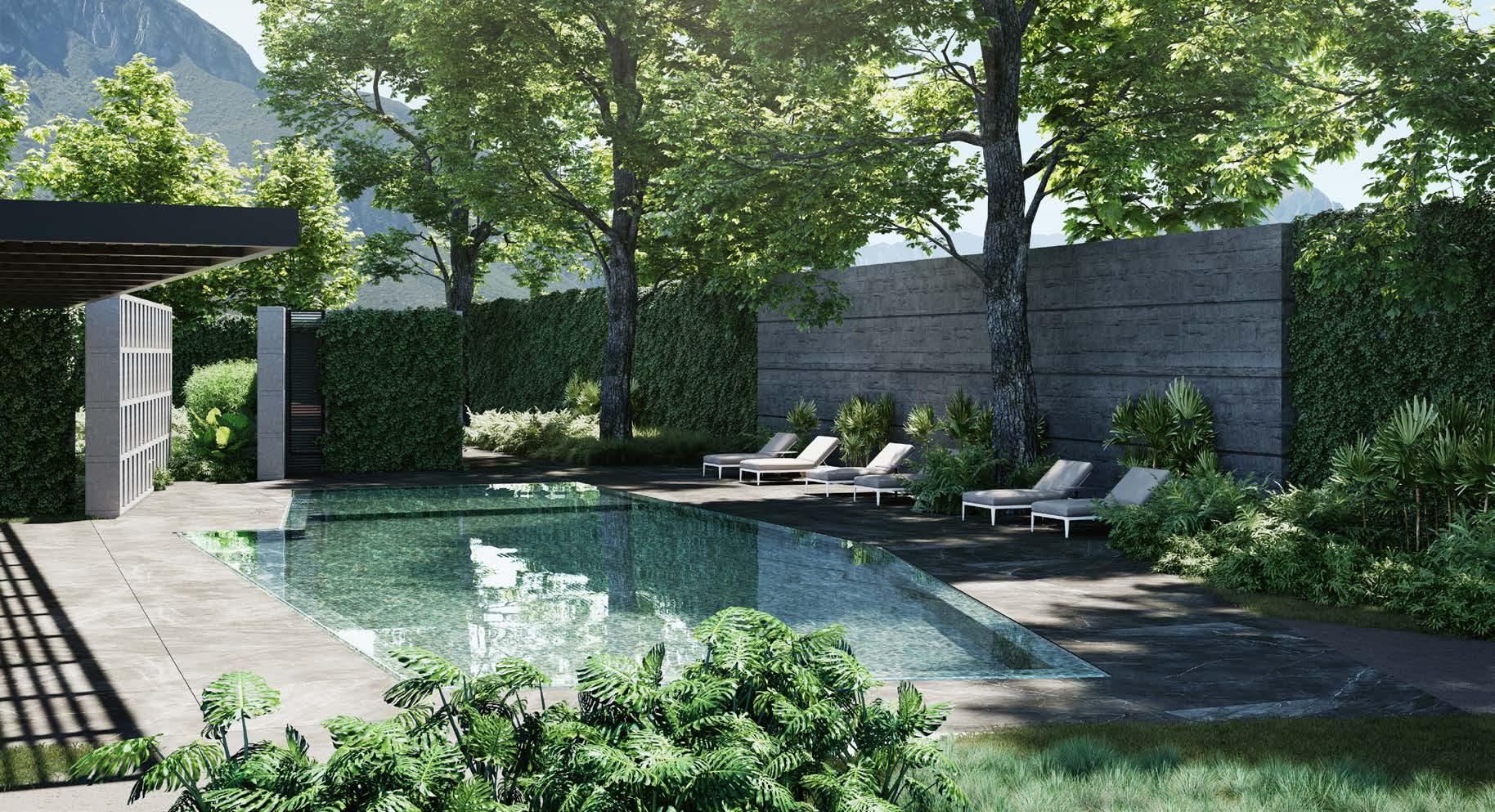Terrace and pool area: clean, organized look with flat lawn and pruned hedges; shaded areas planted with low-light species such as Monstera deliciosa.