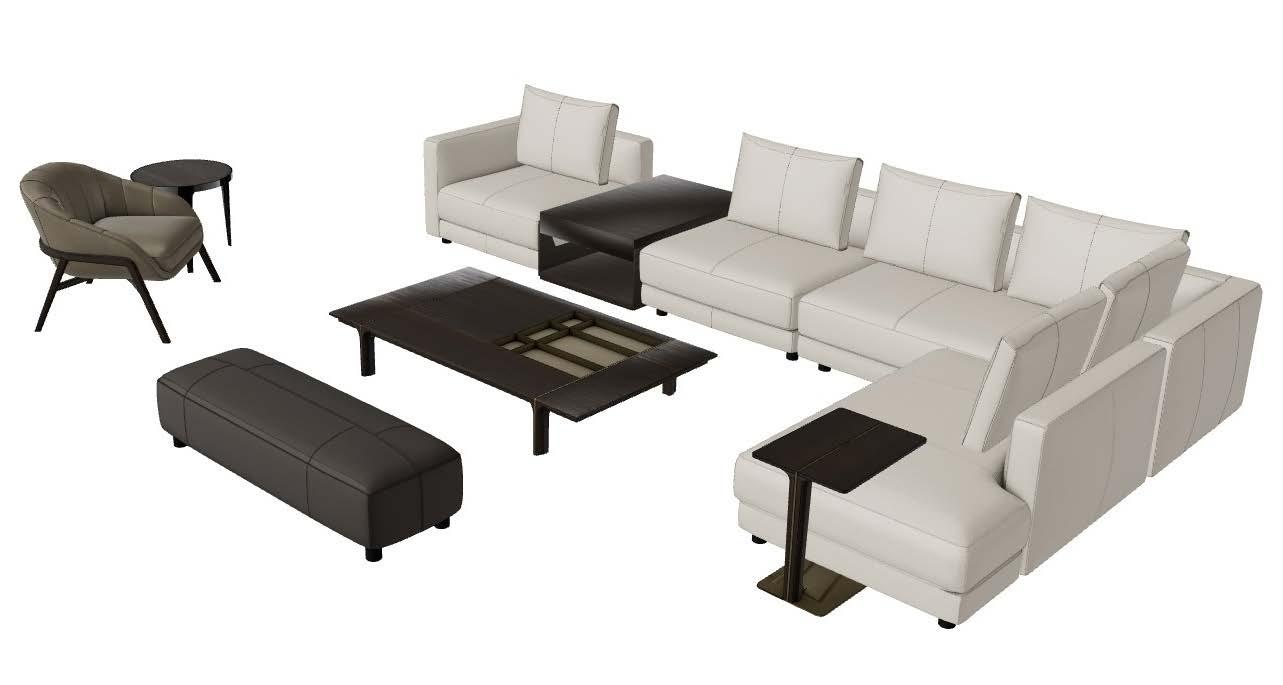 MELPOT livingroom modulation in beige fabric, with CASSIA armchair in taupe leather, KENDO coffee table, and HERMAN side table for client P.G.