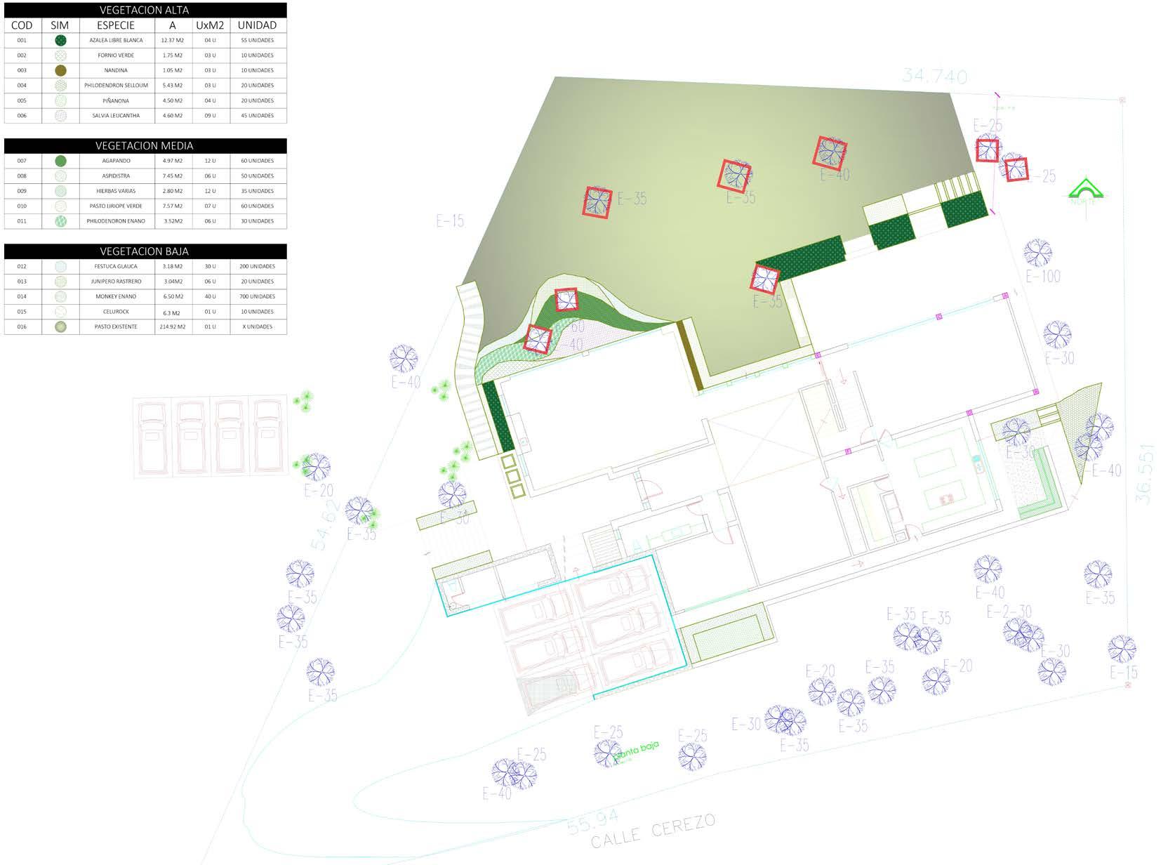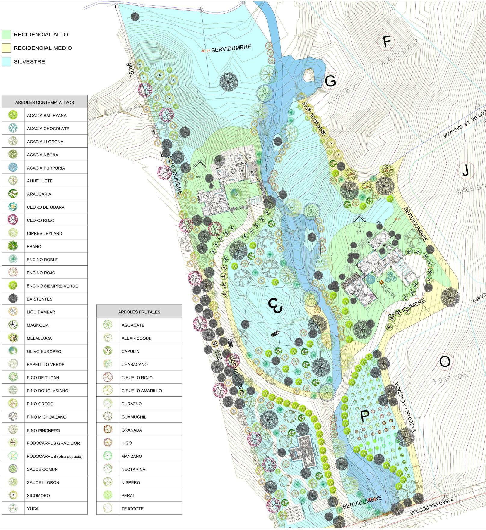 Landscape proposal included: perimeter slopes planted with lowmaintenance vegetation, an exclusive zone with alignments of fruit trees, an orchard with greenhouse, interior patios, and vegetation adjacent to residential structures.