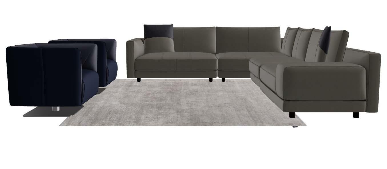 MELPOT sofa modulation in grey leather, with DODI swivel chairs in blue leather and fabric for client V.C