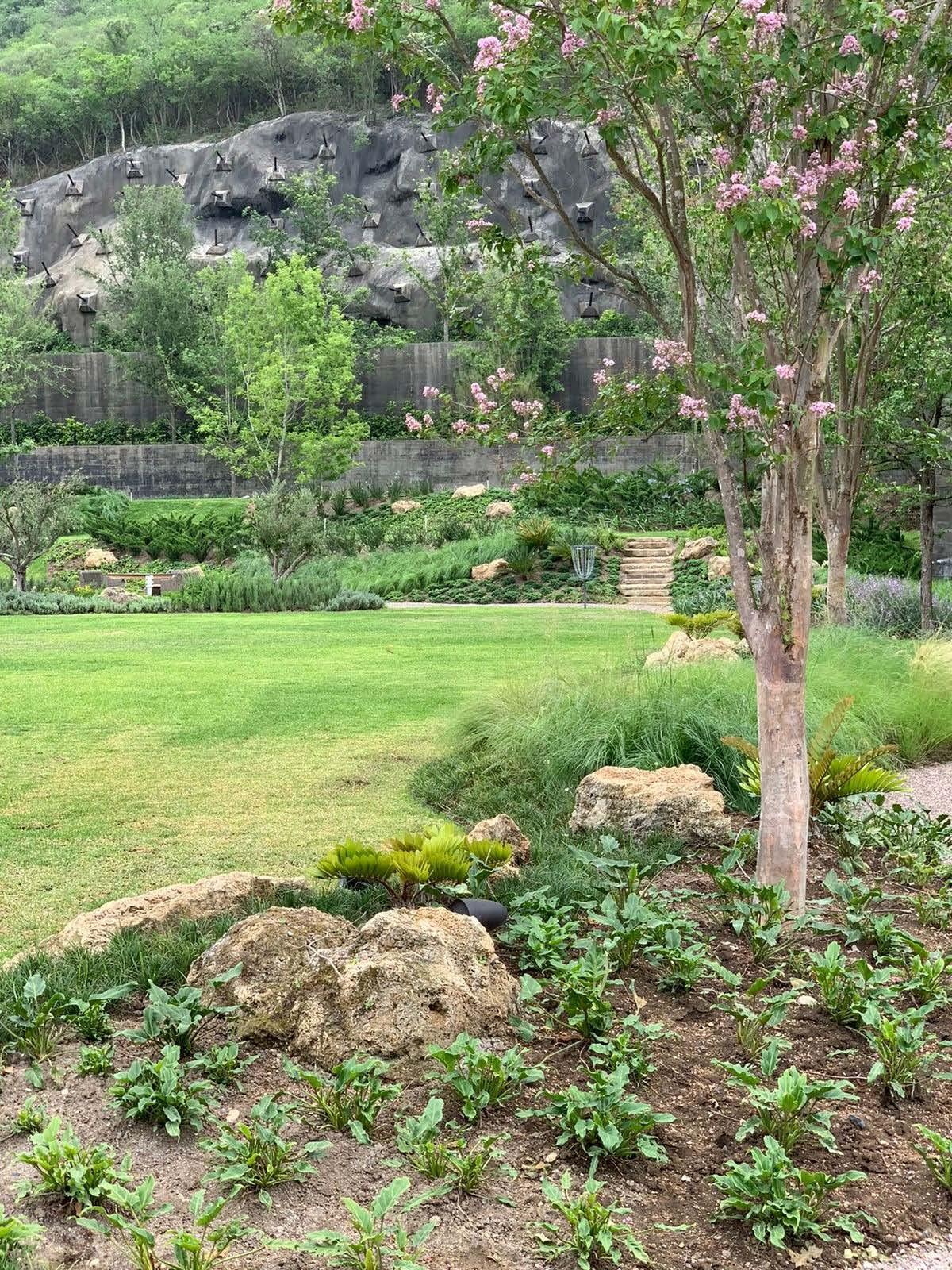 Trees were the focal point, including large specimens such as red oaks, evergreen oaks, crepe myrtles, and European olive trees.