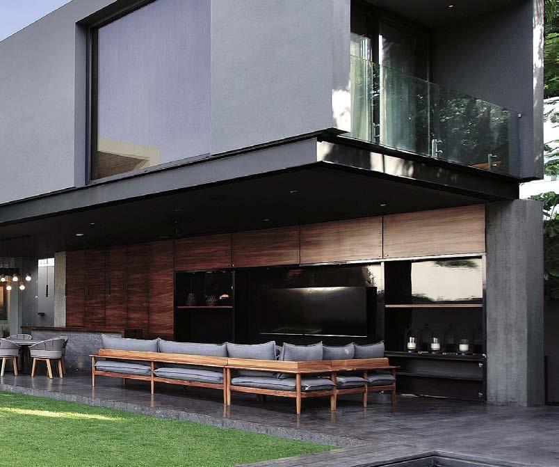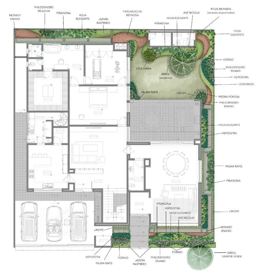 The architect’s signature includes the use of the Arrayán tree as a sculptural element and the Philodendron Xanadú plant.