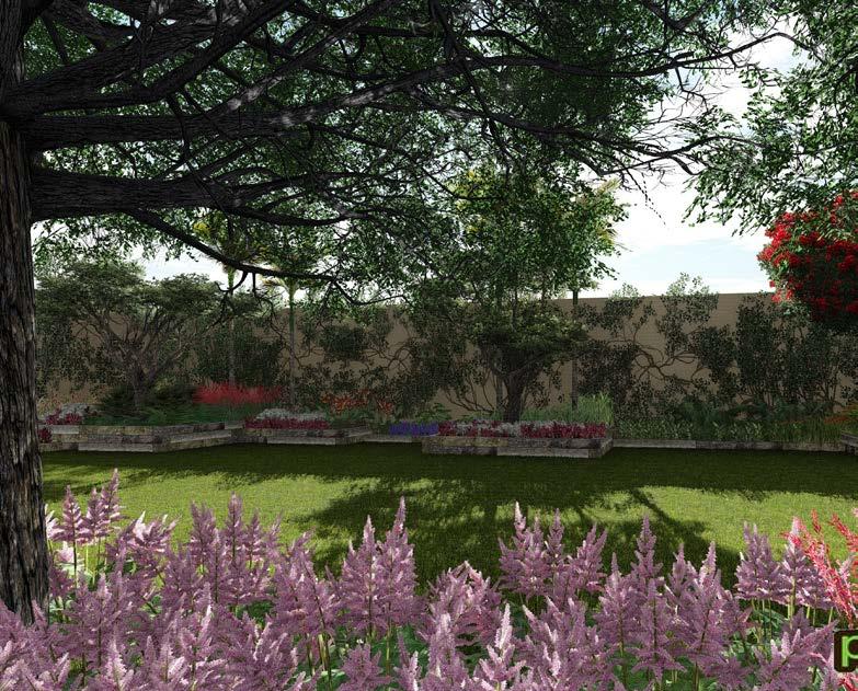Final design: a “wild forest” style with high-texture plants of varying foliage shapes.