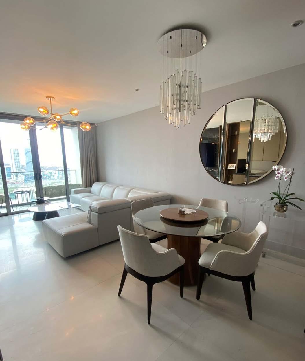 Taking into account the materials of the bar and TV furniture, as well as the area’s layout, a white leather five-seat modular sofa with chaise lounge was proposed, aiming to visually separate the dining area from the TV area
