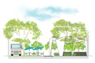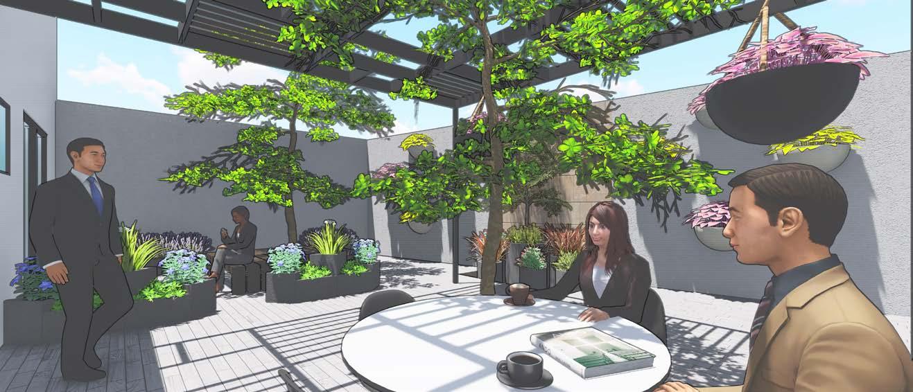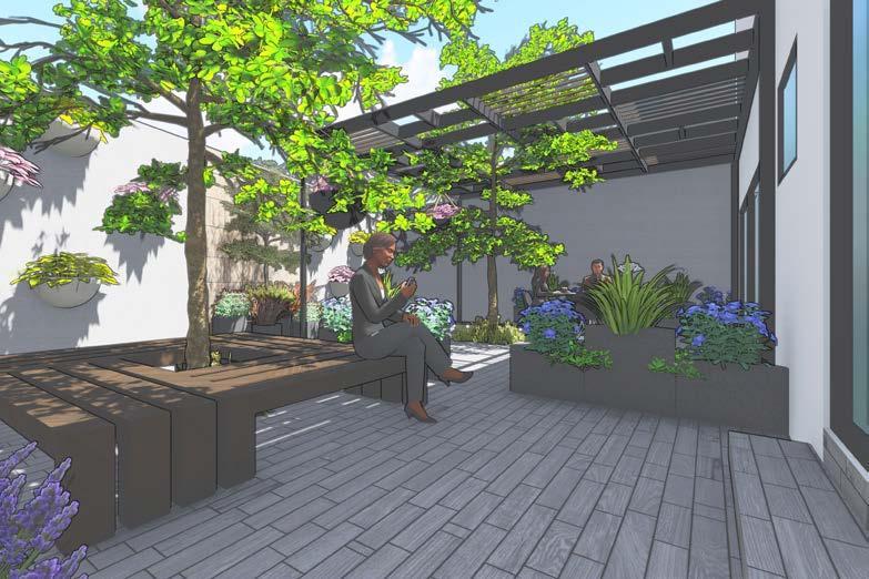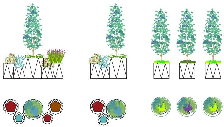 Planters of varying heights were proposed to address the biggest challenge: a soil depth of only 30 cm, insufficient for trees and plants with extensive root systems, due to the underground parking beneath the buildings.