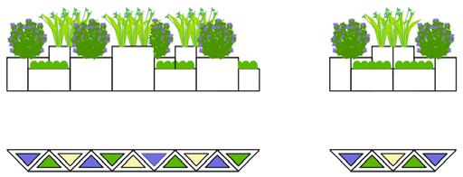 Terrace design with clusters of concrete planters in hexagonal and triangular shapes at varying heights.