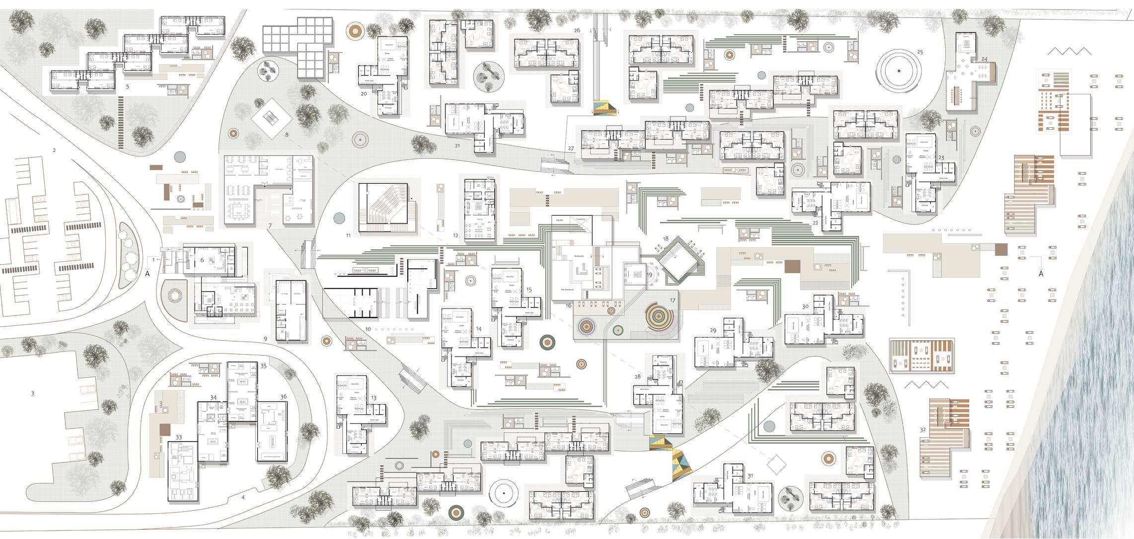 Entrancesituationisdesignedto bewelcomingandjoyful,water featuresareincludedfromthe verybeginningoftheproject escalatingtothewetcones