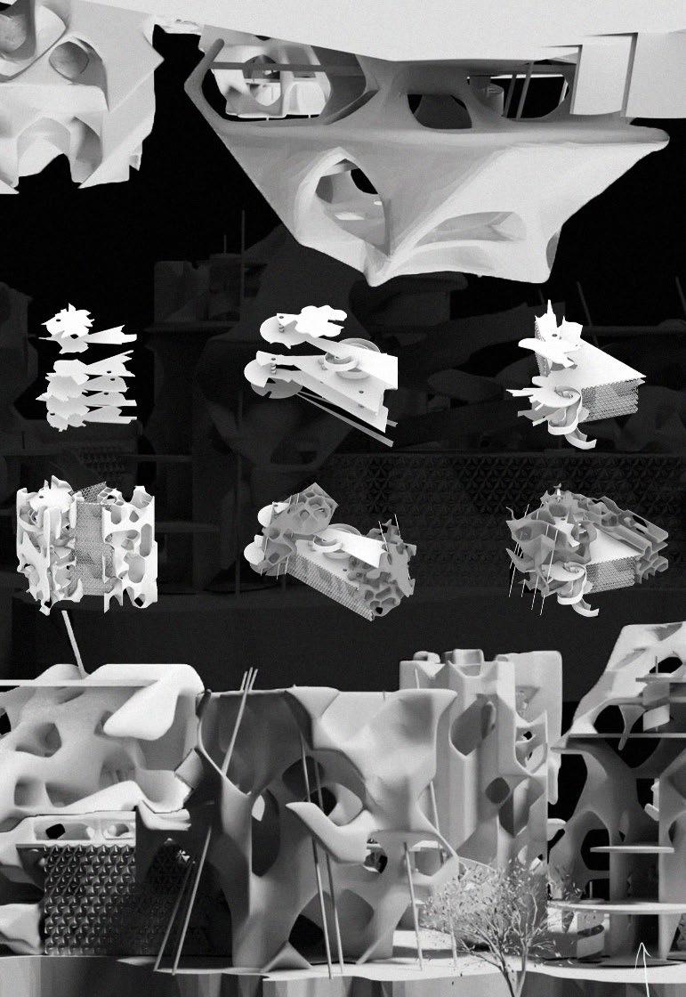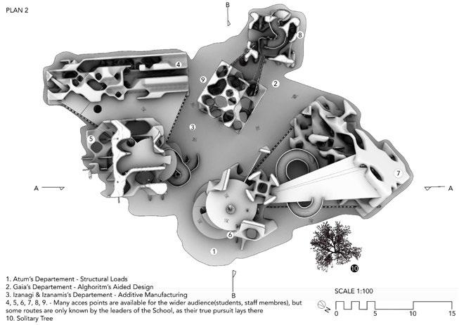With this college, a realm of freedom of thought is to be discovered, expressing the exact state of being in-between. To sum things up, the programme of the building is set by four different beings that are exactly in-between science and religion from three different creation myths. Each of them will be leading different departments that are focusing on how to im- prove building technologies by using digital fabrication. The School itself has been built by them.
