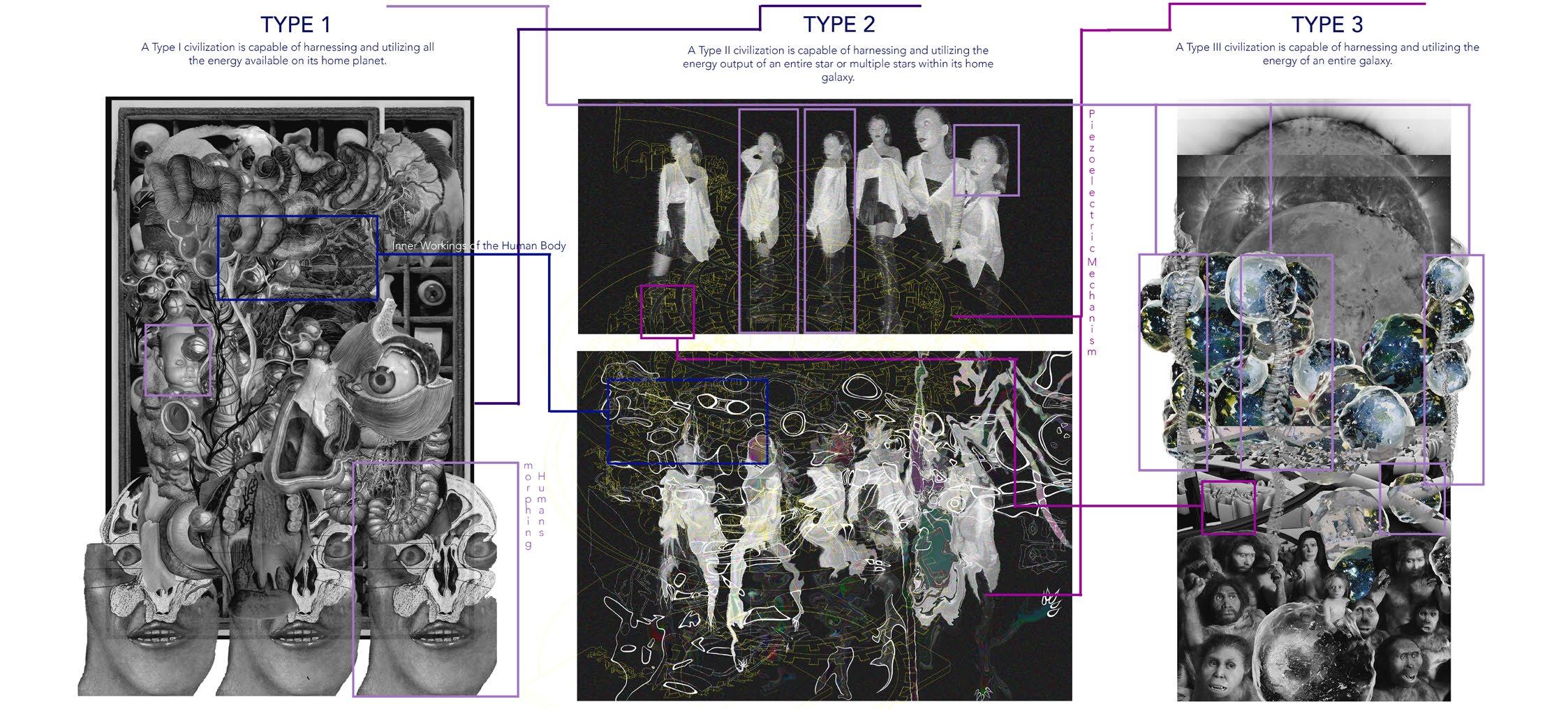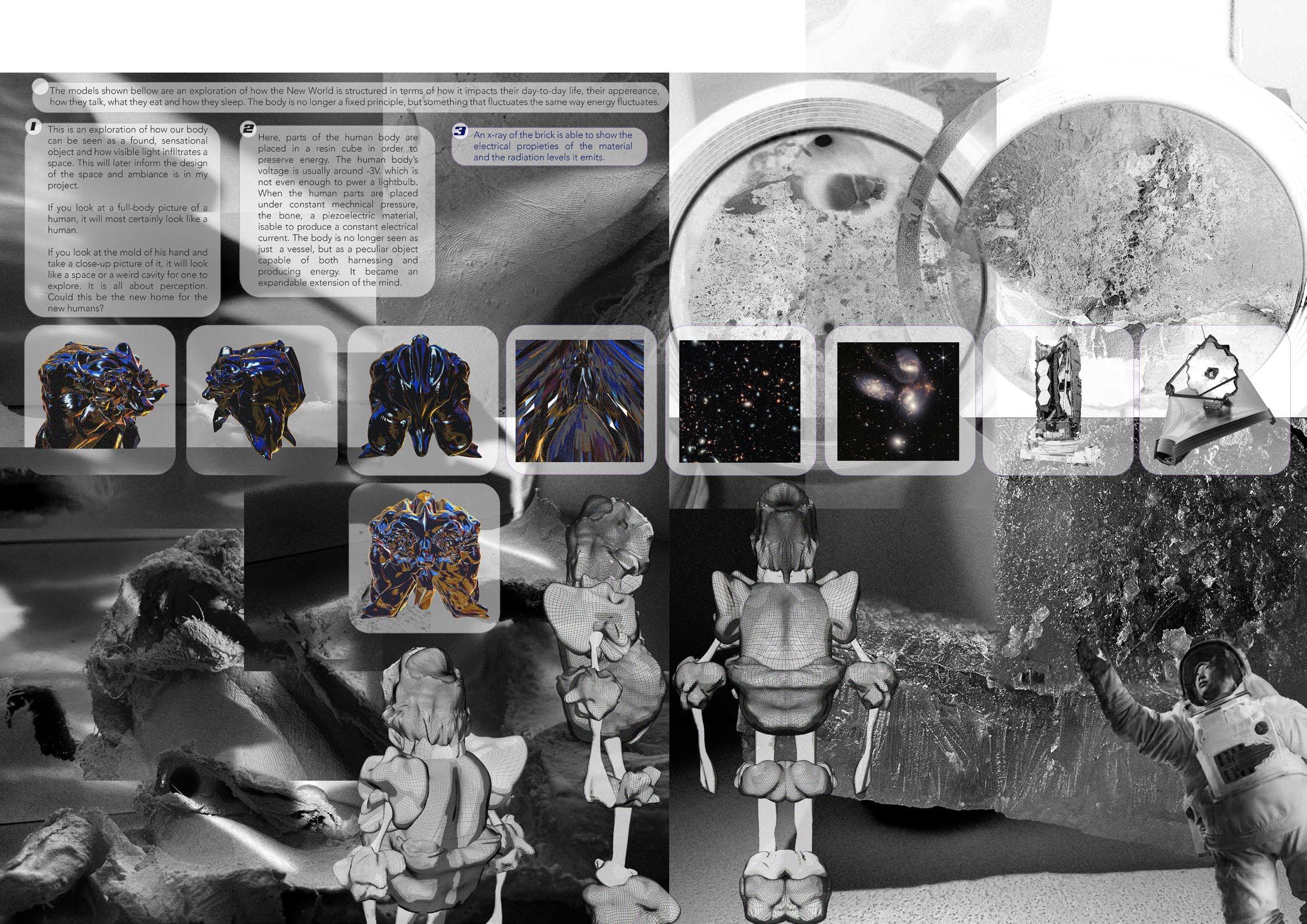 At this stage, am visually establishing the three main stages that the world had go through in order to reach the point we are at right now. My idea for the 5th Revolution morphed throughout the semester, the same way humans had to morph in order to adapt to the new living conditions that arose from harnessing high levels of energy and frequnecy. They became vessels of energy, holding the power to harness it from every single object that exists but laso forced to give it back at every literal step through piezoelectric films installed all over their bodies.