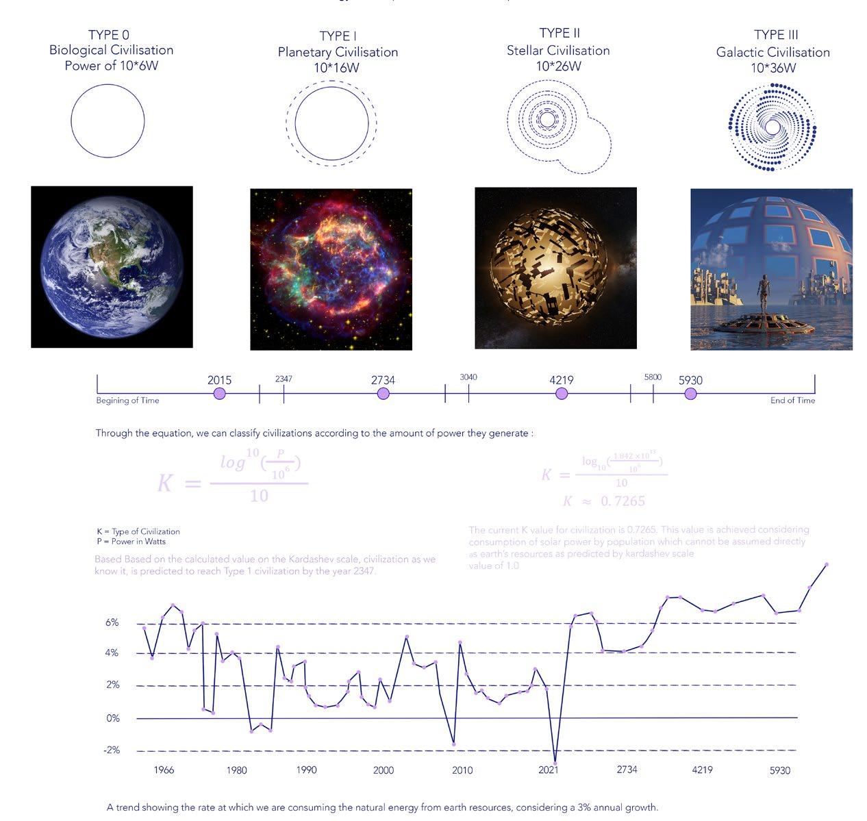 Kardashev, categorizes civilizations based on their ability to harness energy. It has three stages: Type 1 (planetary energy), Type 2 (stellar energy), and Type 3 (galactic energy). Currently, humanity consumes 17 terawatts of energy per second, placing us at 0.72 on the scale as of 2015.