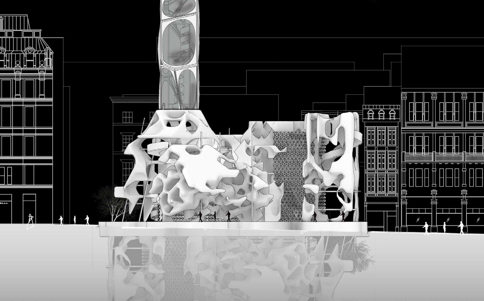 The first two floors have a kinetic facade and are open to the public, while the rest of the floor are merely a sketelon, a workin-progress open for gods only, refelcting the in-between state of the School. It is supposed to be a statement, for those willing to see.