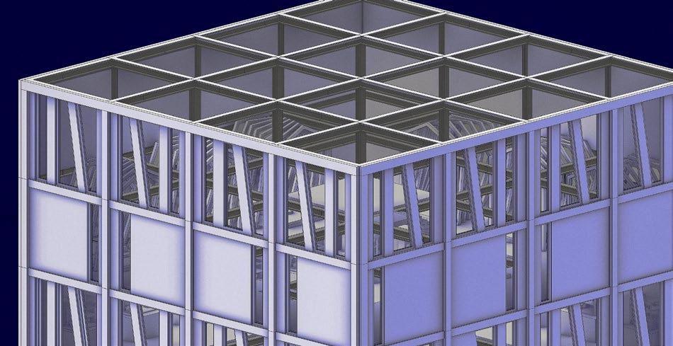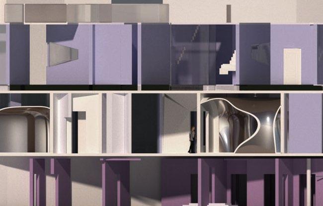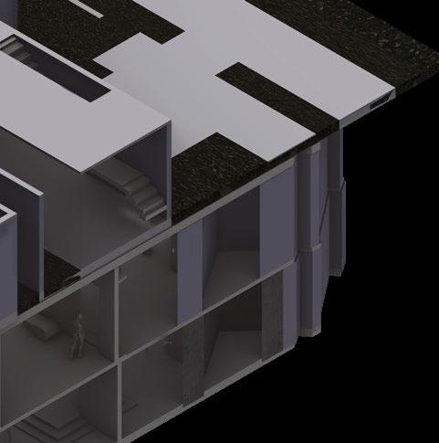 The architecture from beneath goes beyond the established grid in order to bring the outside in and blur de division between the two. To further illustrate this, the main spaces are composed of both normal walls and glass walls. All the glass walls are facing the center of the building.