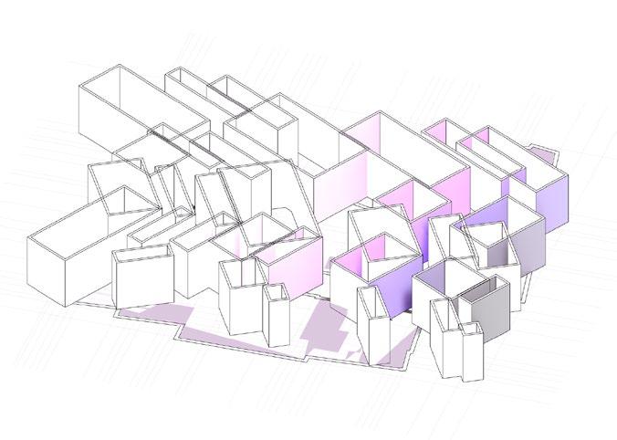 By rotating a grid and finding intersections, the external walls dissolve, creating an immersive experience with no clear boundaries. This design continuously engages inhabitants, requiring constant decisions at every turn.
