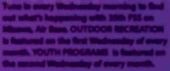 Copyright © 2023 University of Maryland Global Campus Paid Ad. No federal endorsement of advertiser(s) intended. ASIA.UMGC.EDU Attend a no-cost webinar and find your next success at UMGC Asia. Register to attend at asia.umgc.edu/webinars or scan the QR code below. If you apply for admission within 30 days of attending an Intro to UMGC Asia or Graduate Programs webinar, your $50 app fee will be waived! Contact us today! Email: misawa-asia@umgc.edu DSN: (315) 226-8290 CIV: 03-4545-1470 EVERY WEDNESDAY 7-8 a.m. on AFN 1575 THE EAGLE Tune in every Wednesday morning to find out what’s happening with 35th FSS on Misawa, Air Base. OUTDOOR RECREATION is featured on the first Wednesday of every month. YOUTH PROGRAMS is featured on the second Wednesday of every month. FSS HOUR 34 | October 2023