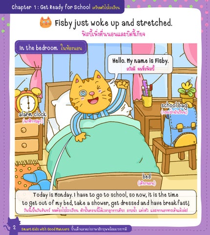 Today is Monday. I have to go to school, so now, it is the time to get out of my bed, take a shower, get dressed and have breakfast! วันนี้เป็นวันจันทร์ ผมต้องไปโรงเรียน ดังนั้นตอนนี้ได้เวลาลุกจากเตียง อาบน�้า แต่งตัว และทานอาหารเช้าแล้วล่ะ!