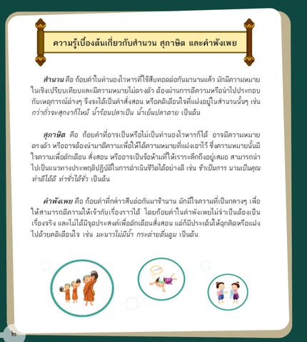 ความรู้เบื้องต้นเกี่ยวกับสำ�นวน สุภาษิต และคำ�พังเพย ส�ำนวน คือ ถ้อยค�ำในท�ำนองโวหารที่ ใช้สบื ทอดต่อกันมานานแล้ว มักมีความหมาย ในเชิงเปรียบเทียบและมีความหมายไม่ตรงตัว ต้องผ่านการตีความหรือน�ำไปประกอบ กับเหตุการณ์ตา่ งๆ จึงจะได้เป็นค�ำสัง่ สอน หรือคติเตือนใจทีแ่ ฝงอยู่ ในส�ำนวนนัน้ ๆ เช่น กว่าถั่วจะสุกงาก็ ไหม้ น�้ำร้อนปลาเป็น น�้ำเย็นปลาตาย เป็นต้น สุภาษิต คือ ถ้อยค�ำที่อาจเป็นหรือไม่เป็นท�ำนองโวหารก็ ได้ อาจมีความหมาย ตรงตัว หรืออาจต้องน�ำมาตีความเพือ่ ให้ ได้ความหมายทีแ่ ฝงเอาไว้ ซึง่ ความหมายนัน้ มี ใจความเพือ่ ตักเตือน สัง่ สอน หรืออาจเป็นข้อห้ามที่ ให้เราระลึกถึงอยูเ่ สมอ สามารถน�ำ ไปเป็นแนวทางประพฤติปฏิบตั ิในการด�ำเนินชีวติ ได้อย่างดี เช่น ช้าเป็นการ นานเป็นคุณ ท�ำดี ได้ดี ท�ำชั่วได้ชั่ว เป็นต้น ค�ำพังเพย คือ ถ้อยค�ำที่กล่าวสืบต่อกันมาช้านาน มักมี ใจความที่เป็นกลางๆ เพื่อ ให้สามารถตีความให้เข้ากับเรื่องราวได้ โดยถ้อยค�ำในค�ำพังเพยไม่จ�ำเป็นต้องเป็น เรือ่ งจริง และไม่ ได้มีจุดประสงค์เพือ่ ตักเตือนสั่งสอน แต่กม็ ปี ระเด็นให้ฉกุ คิดหรือแฝง ไปด้วยคติเตือนใจ เช่น มะนาวไม่มีน�้ำ กระต่ายตื่นตูม เป็นต้น