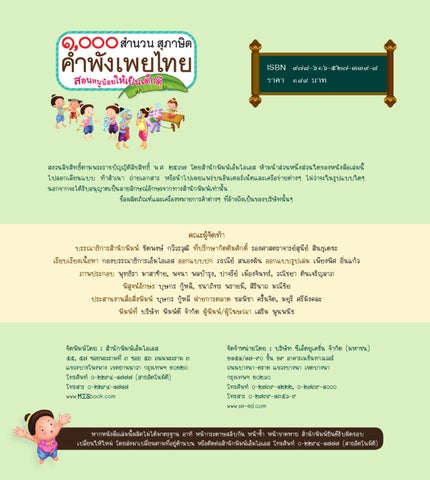 คณะผู้จัดท�ำ บรรณาธิการส�ำนักพิมพ์ ชิดพงษ์ กวีวรวุฒิ ที่ปรึกษากิตติมศักดิ์ รองศาสตราจารย์สุนีย์ สินธุเดชะ เรียบเรียงเนื้อหา กองบรรณาธิการเอ็มไอเอส ออกแบบปก ภรณีย์ สนองผัน ออกแบบรูปเล่ม เพียงพิศ อิ่นแก้ว ภาพประกอบ พุทธิรา มาสาซ้าย, พจนา พลบ�ำรุง, ปาจรีย์ เมืองจันทร์, วณิชยา ตันเจริญลาภ พิสูจน์อักษร บุษกร กู้หลี, ชนาภัทร พรายมี, สิรินาถ มณีชัย ประสานงานสื่อสิ่งพิมพ์ บุษกร กู้หลี ฝ่ายการตลาด ชลพิชา ครื้นจิต, มยุรี ศรีมังคละ พิมพ์ที่ บริษัท พิมพ์ดี จ�ำกัด ผู้พิมพ์/ผู้โฆษณา เสริม พูนพนิช