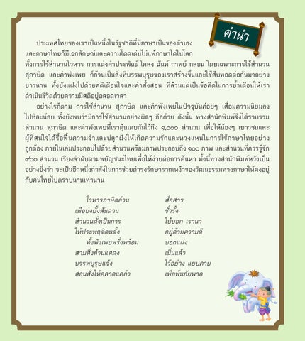 ประเทศไทยของเราเป็นหนึ่งในรัฐชาติที่มีภาษาเป็นของตัวเอง และภาษาไทยก็มีเอกลักษณ์และความโดดเด่นไม่แพ้ภาษาใดในโลก ทั้งการใช้ส�ำนวนโวหาร การแต่งค�ำประพันธ์ โคลง ฉันท์ กาพย์ กลอน โดยเฉพาะการใช้ส�ำนวน สุภาษิต และค�ำพังเพย ก็ล้วนเป็นสิ่งที่บรรพบุรุษของเราสร้างขึ้นและใช้สืบทอดต่อกันมาอย่าง ยาวนาน ทั้งยังแฝงไปด้วยคติเตือนใจและค�ำสั่งสอน ที่ล้วนแต่เป็นข้อคิดในการย�้ำเตือนให้เรา ด�ำเนินชีวิตด้วยความมีสติอยู่ตลอดเวลา อย่างไรก็ตาม การใช้ส�ำนวน สุภาษิต และค�ำพังเพยในปัจจุบันค่อยๆ เสื่อมความนิยมลง ไปทีละน้อย ทั้งยังพบว่ามีการใช้ส�ำนวนอย่างผิดๆ อีกด้วย ดังนั้น ทางส�ำนักพิมพ์จึงได้รวบรวม ส�ำนวน สุภาษิต และค�ำพังเพยที่เราคุ้นเคยกันไว้ถึง ๑,๐๐๐ ส�ำนวน เพื่อให้น้องๆ เยาวชนและ ผู้ที่สนใจได้รื้อฟื้นความจ�ำและปลูกฝังให้เกิดความรักและหวงแหนในการใช้ภาษาไทยอย่าง ถูกต้อง ภายในเล่มประกอบไปด้วยส�ำนวนพร้อมภาพประกอบถึง ๑๐๐ ภาพ และส�ำนวนทีค่ วรรูจ้ กั ๙๐๐ ส�ำนวน เรียงล�ำดับตามพยัญชนะไทยเพื่อให้ง่ายต่อการค้นหา ทั้งนี้ทางส�ำนักพิมพ์หวังเป็น อย่างยิ่งว่า จะเป็นอีกหนึ่งก�ำลังในการช่วยด�ำรงรักษารากเหง้าของวัฒนธรรมทางภาษาให้คงอยู่ กับคนไทยไปตราบนานเท่านาน โวหารภาษิตล้วน เพื่อบ่งยั้งสันดาน ส�ำนวนดั่งเป็นการ ให้ประพฤติตนตั้ง ทั้งพังเพยพรั่งพร้อม สามสิ่งล้วนแสดง บรรพบุรุษแจ้ง สอนสั่งให้คลาดแคล้ว