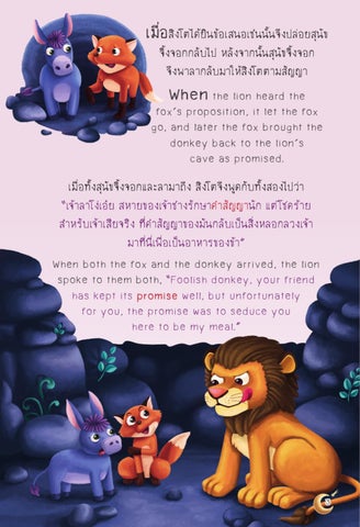 เมือ่ ทั้งสุนัขจิ้งจอกและลามาถึง สิงโตจึงพูดกับทั้งสองไปว่า “เจ้าลาโง่เอ๋ย สหายของเจ้าช่างรักษาค�ำสัญญานัก แต่ โชคร้าย ส�ำหรับเจ้าเสียจริง ที่ค�ำสัญญาของมันกลับเป็นสิ่งหลอกลวงเจ้า มาที่นี่เพื่อเป็นอาหารของข้า” When both the fox and the donkey arrived, the lion spoke to them both, “Foolish donkey, your friend has kept its promise well, but unfortunately for you, the promise was to seduce you here to be my meal.”