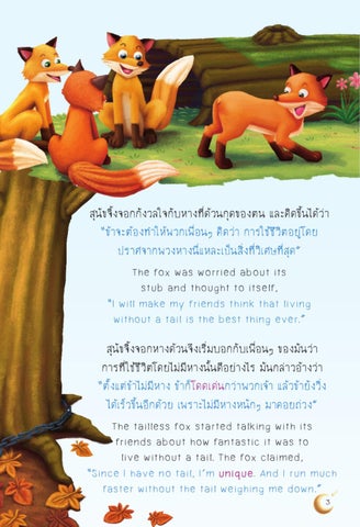 สุนัขจิ้งจอกหางด้วนจึงเริม่ บอกกับเพือ่ นๆ ของมันว่า การที่ ใช้ชีวิตโดยไม่มหี างนั้นดีอย่างไร มันกล่าวอ้างว่า “ตั้งแต่ข้าไม่มหี าง ข้าก็ โดดเด่นกว่าพวกเจ้า แล้วข้ายังวิง่ ได้เร็วขึ้นอีกด้วย เพราะไม่มหี างหนักๆ มาคอยถ่วง” The tailless fox started talking with its friends about how fantastic it was to live without a tail. The fox claimed, “Since I have no tail, I’m unique. And I run much faster without the tail weighing me down.” 3