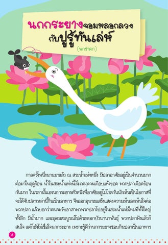 กาลครัง้ หนึง่ นานมาแล้ว ณ สระน�า้ แห่งหนึง่ มีปลาอาศัยอยูเ่ ป็นจ�านวนมาก ต่อมาในฤดูรอ้ น น�า้ ในสระน�า้ แห่งนีเ้ ริม่ ลดลงจนเกือบแห้งขอด พวกปลาเดือดร้อน กันมาก ในเวลานัน้ เองนกกระยางตัวหนึง่ ทีอ่ าศัยอยูไ่ ม่ไกลกันนักเห็นเป็นโอกาสที่ จะได้จบั ปลาเหล่านีก้ นิ เป็นอาหาร จึงออกอุบายแสร้งแสดงความเห็นอกเห็นใจต่อ พวกปลา แล้วบอกว่าตนจะรับอาสาพาพวกปลาไปอยู่ ในสระน�า้ แห่งใหม่ทที่ งั้ ใหญ่ ทั้งลึก มีน�้ามาก และอุดมสมบูรณ์ไปด้วยดอกบัวนานาพันธุ์ พวกปลาฟังแล้วก็ สนใจ แต่กย็ งั ไม่เชือ่ ใจนกกระยาง เพราะรูด้ วี า่ นกกระยางชอบกินปลาเป็นอาหาร