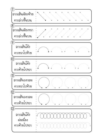 7 ลากเส้นเฉียงซ้าย จากล่างขึ้นบน 8 ลากเส้นเฉียงขวา จากล่างขึ้นบน 9 ลากเส้นโค้ง จากขวาไปซ้าย 10 ลากเส้นโค้ง จากซ้ายไปขวา 11 ลากเส้นวงกลม จากขวาไปซ้าย 12 ลากเส้นวงกลม จากซ้ายไปขวา 13 ลากเส้นโค้ง ต่อเนื่อง จากซ้ายไปขวา