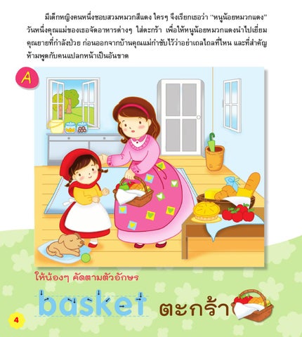 มีเด็กหญิงคนหนึง่ ชอบสวมหมวกสีแดง ใครๆ จึงเรียกเธอว่า “หนูนอ้ ยหมวกแดง” วันหนึ่งคุณแม่ของเธอจัดอาหารต่างๆ ใส่ตะกร้า เพื่อให้หนูน้อยหมวกแดงนำ�ไปเยี่ยม คุณยายทีก่ �ำ ลังป่วย ก่อนออกจากบ้านคุณแม่ก�ำ ชับไว้วา่ อย่าเถลไถลทีไ่ หน และทีส่ �ำ คัญ ห้ามพูดกับคนแปลกหน้าเป็นอันขาด