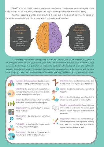 body, shows how we feel, think, and move. The key of learning comes from the brain’s ability. Therefore, boosting a child’s brain growth (2-6 years old) is the basis of learning. It’s based on the left brain and right brain dominance which both sides work together.
