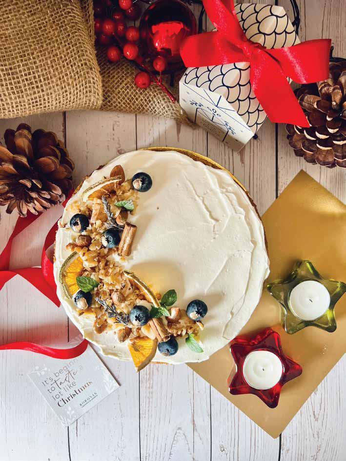 Torta esponjosa de zanahoria con anís, cardamomo, clavo de olor, jengibre, canela y pimienta dulce con cobertura de queso crema