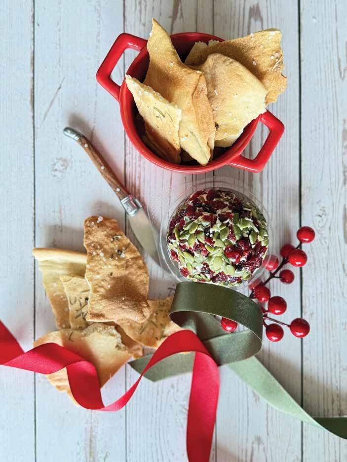 Queso untable con jamón serrano y cebollín en una costra de semillas de calabaza y cranberries