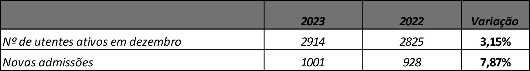 Um primeiro destaque para o facto de, em 2023, graças aos resultados obtidos, termos voltado a reforçar de forma clara a nossa sustentabilidade. Assim, foi possível garantir não só a consolidação de todas as respostas existentes, como ainda conseguir aumentar o número de utentes abrangidos, tudo isto, melhorando a qualidade do serviço prestado. Chegamos a mais pessoas, respondemos às suas necessidades de forma mais assertiva e melhoramos objetivamente a sua qualidade de vida!