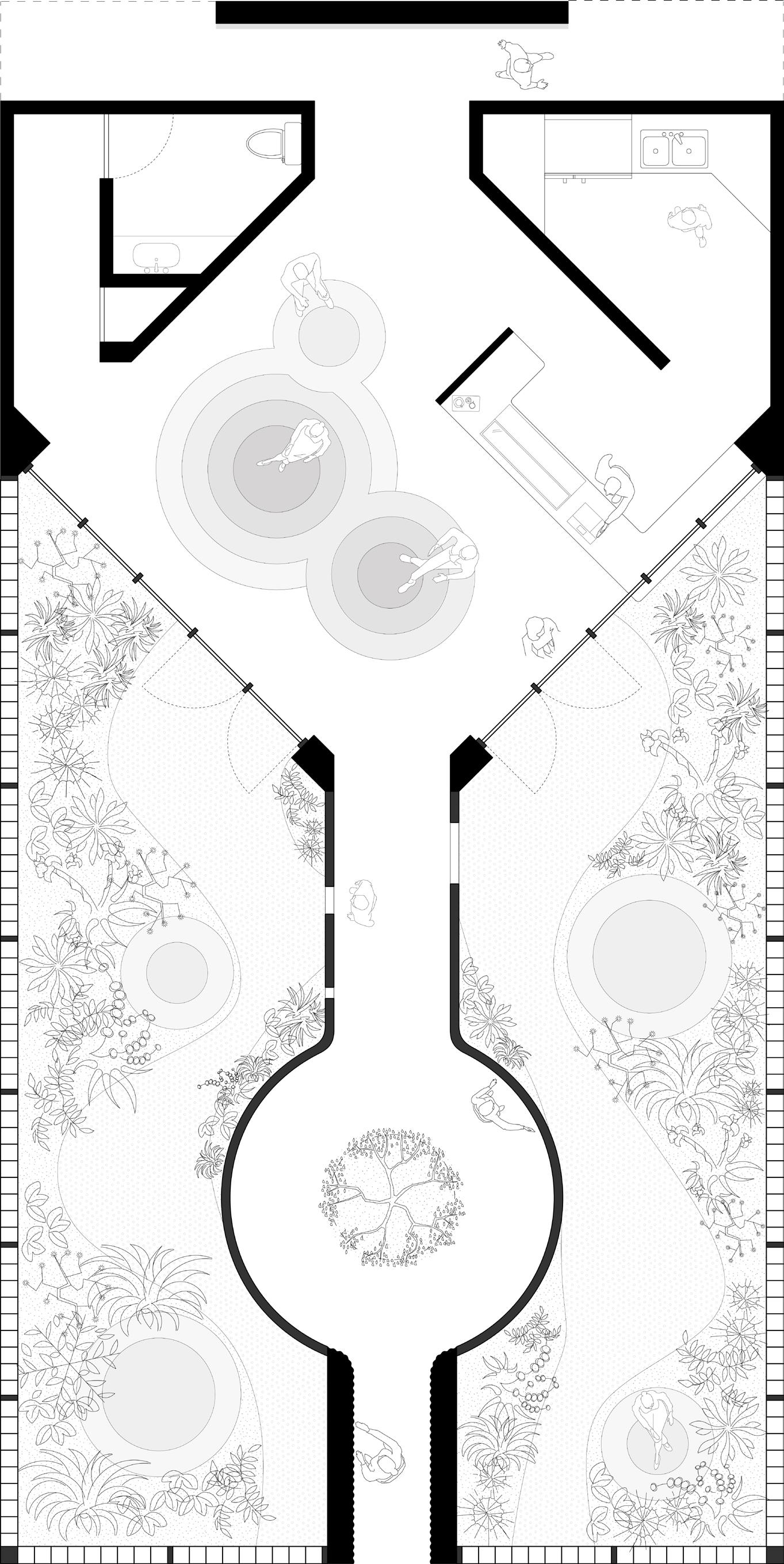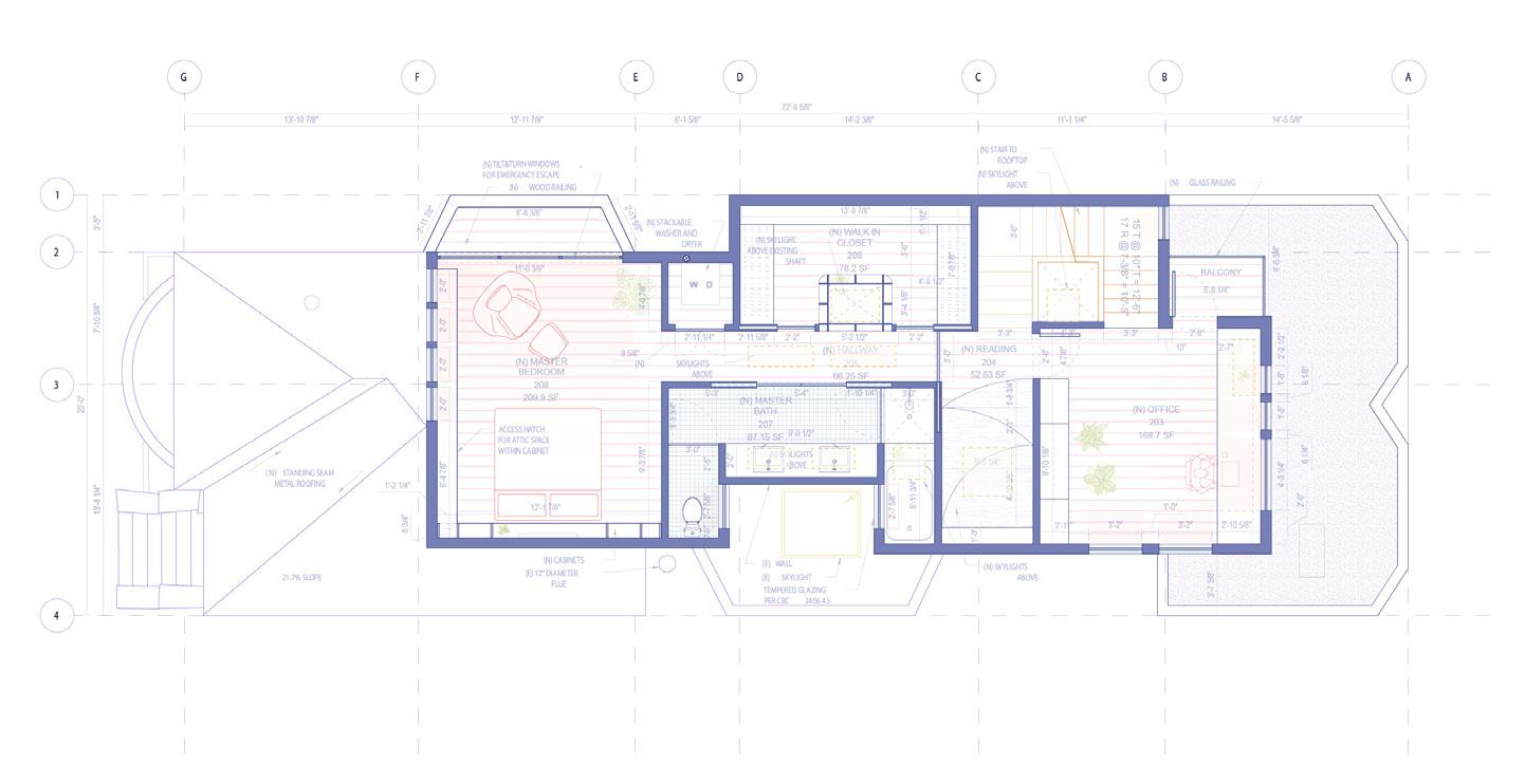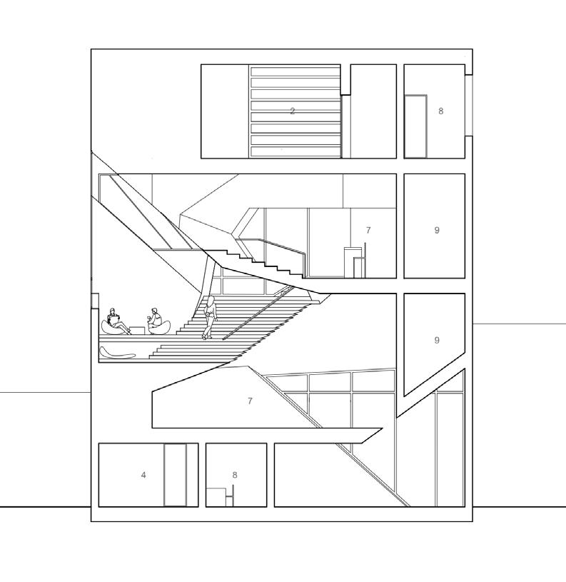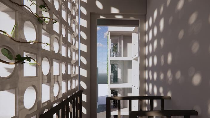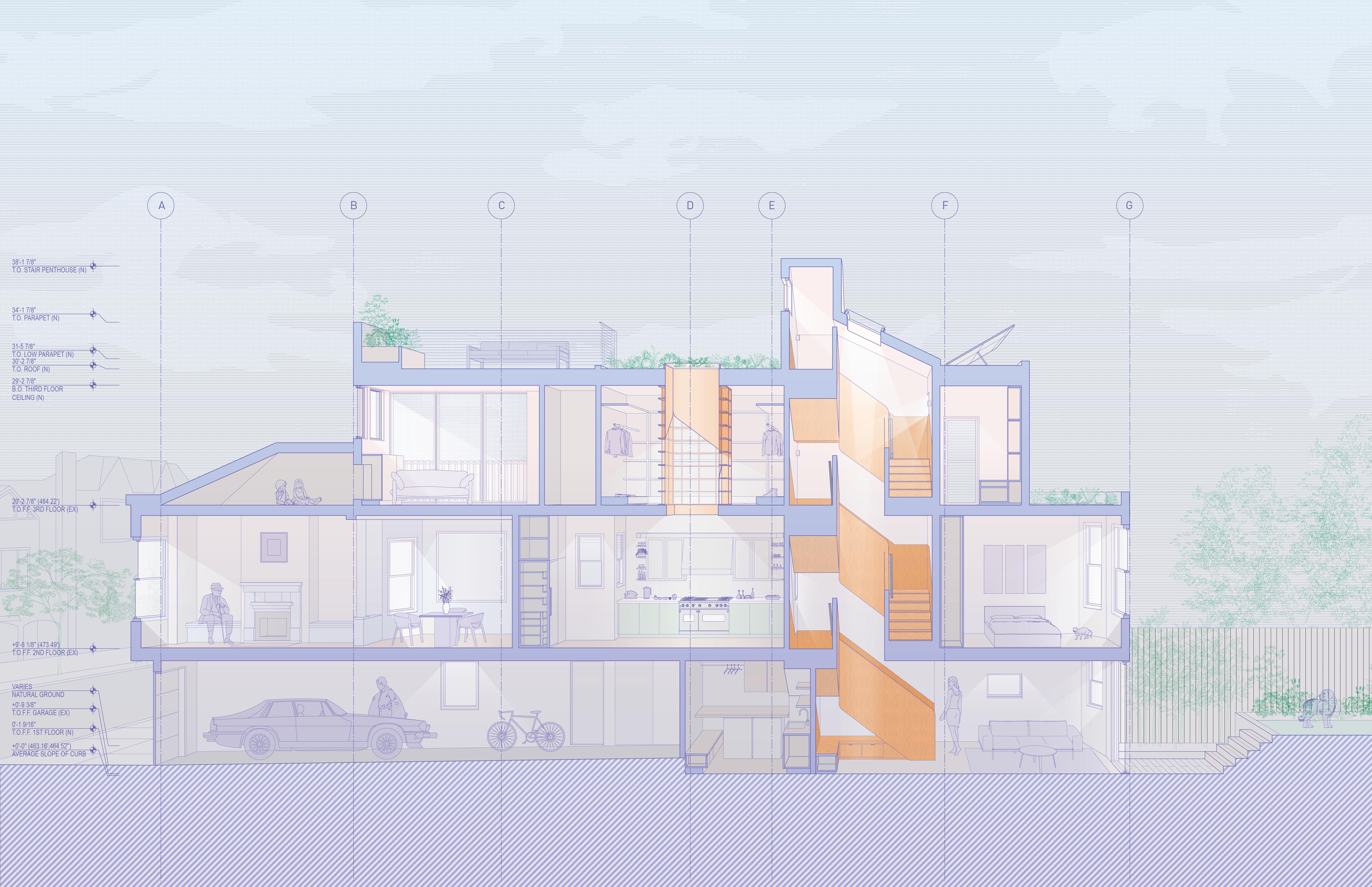 Through my representational drawings, I highlighted the essence of this already designed townhouse, focusing on the flow of natural light through its various entrances, the livability of the spaces, and the sculptural staircase as the central focal point. While I did not design the project itself, I developed the visual representation by modifying the 3D SketchUp model, utilizing AutoCAD for lineowrk, and Adobe Illustrator for the hatches and color.