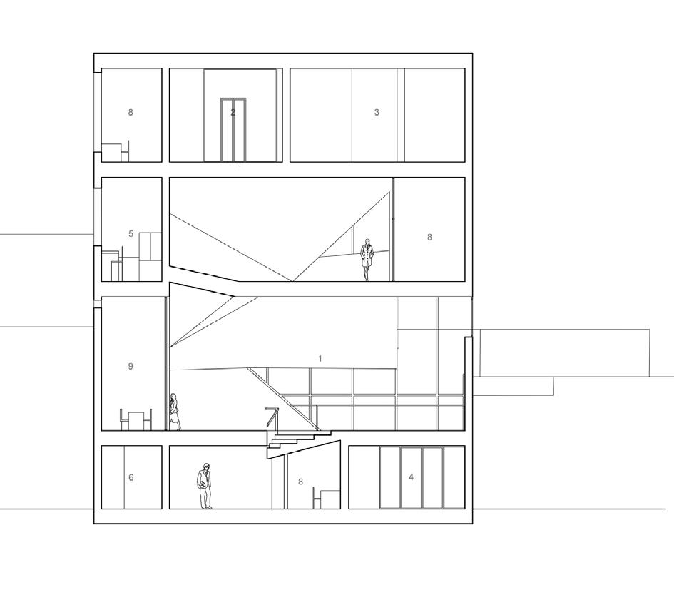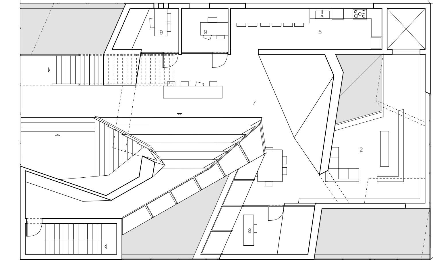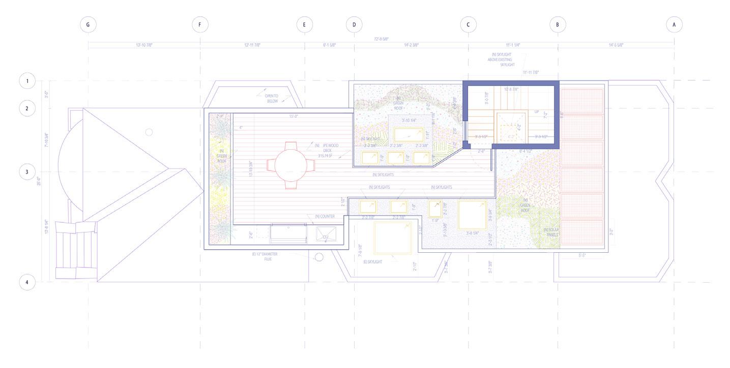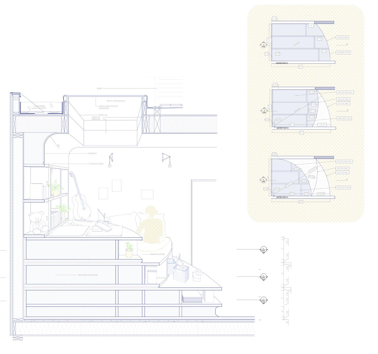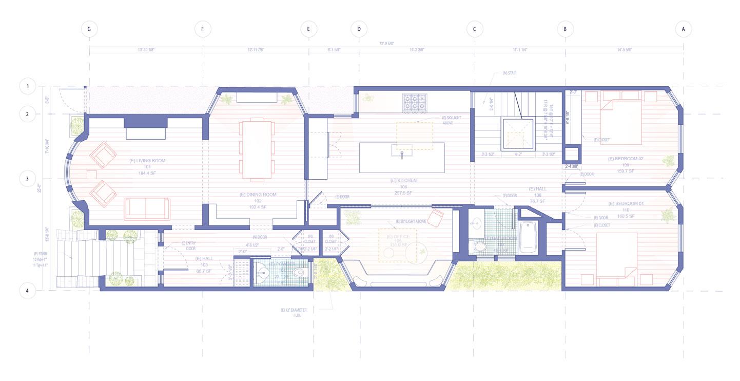 Through my representational drawings, I highlighted the essence of this already designed townhouse, focusing on the flow of natural light through its various entrances, the livability of the spaces, and the sculptural staircase as the central focal point. While I did not design the project itself, I developed the visual representation by modifying the 3D SketchUp model, utilizing AutoCAD for lineowrk, and Adobe Illustrator for the hatches and color.