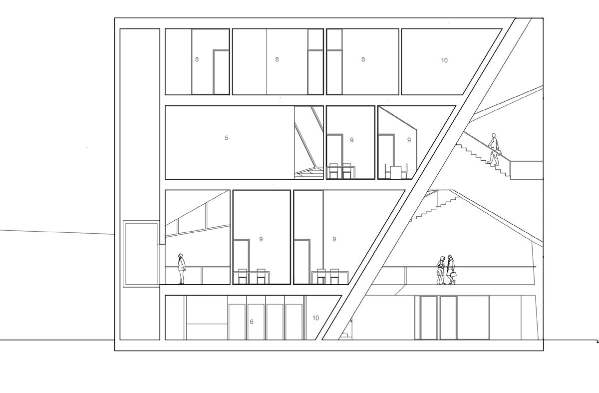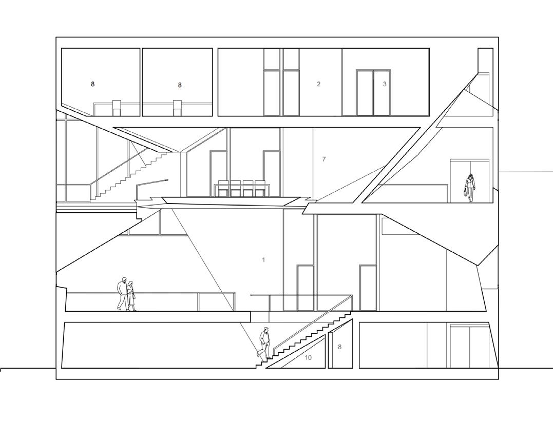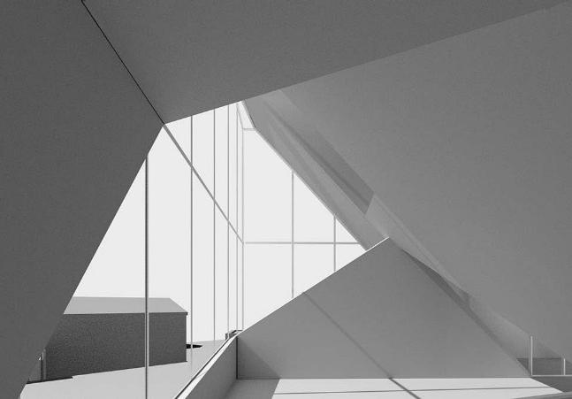 This faceted office design breaks away from traditional, rigid workspaces. The sculptural folds create an interconnected interior, allowing individuals to work both independently and collaboratively, all while fostering a sense of belonging within the space.