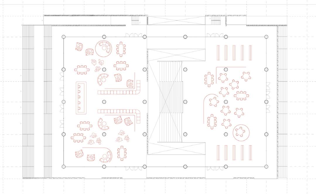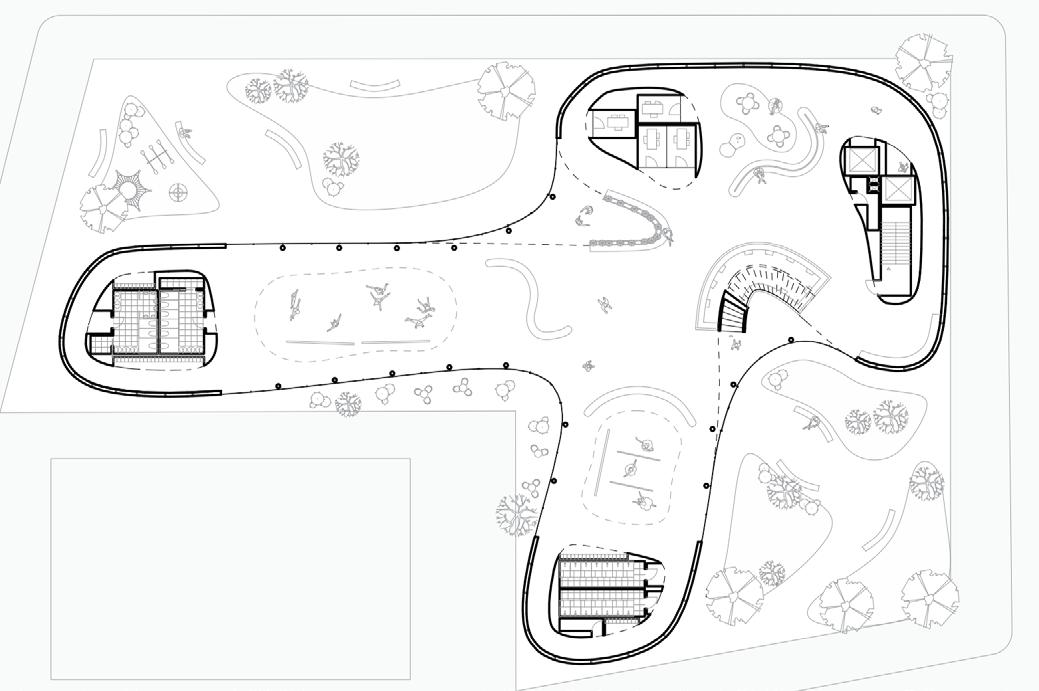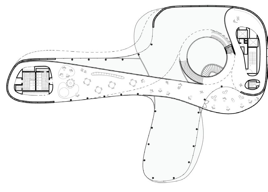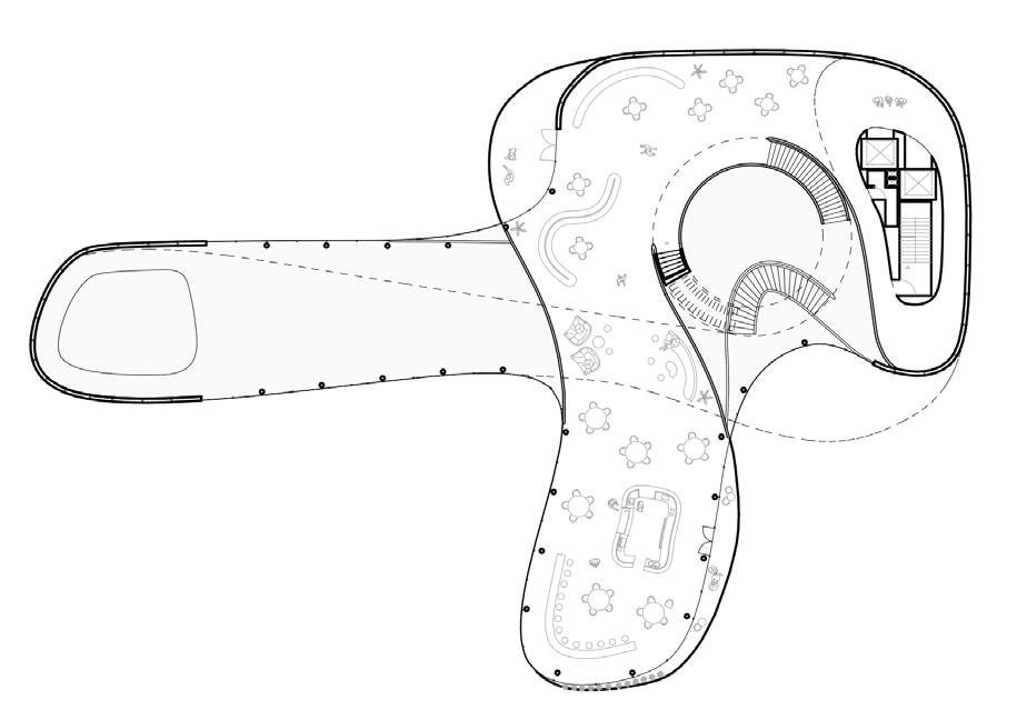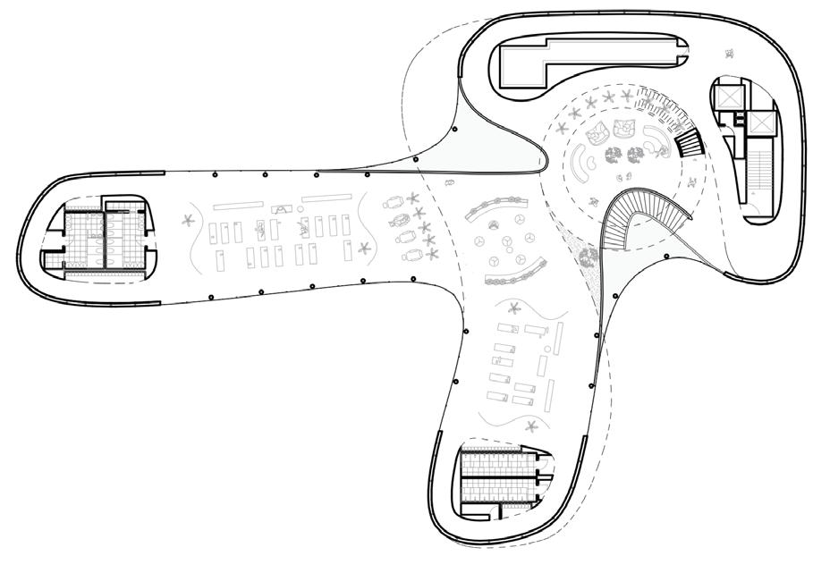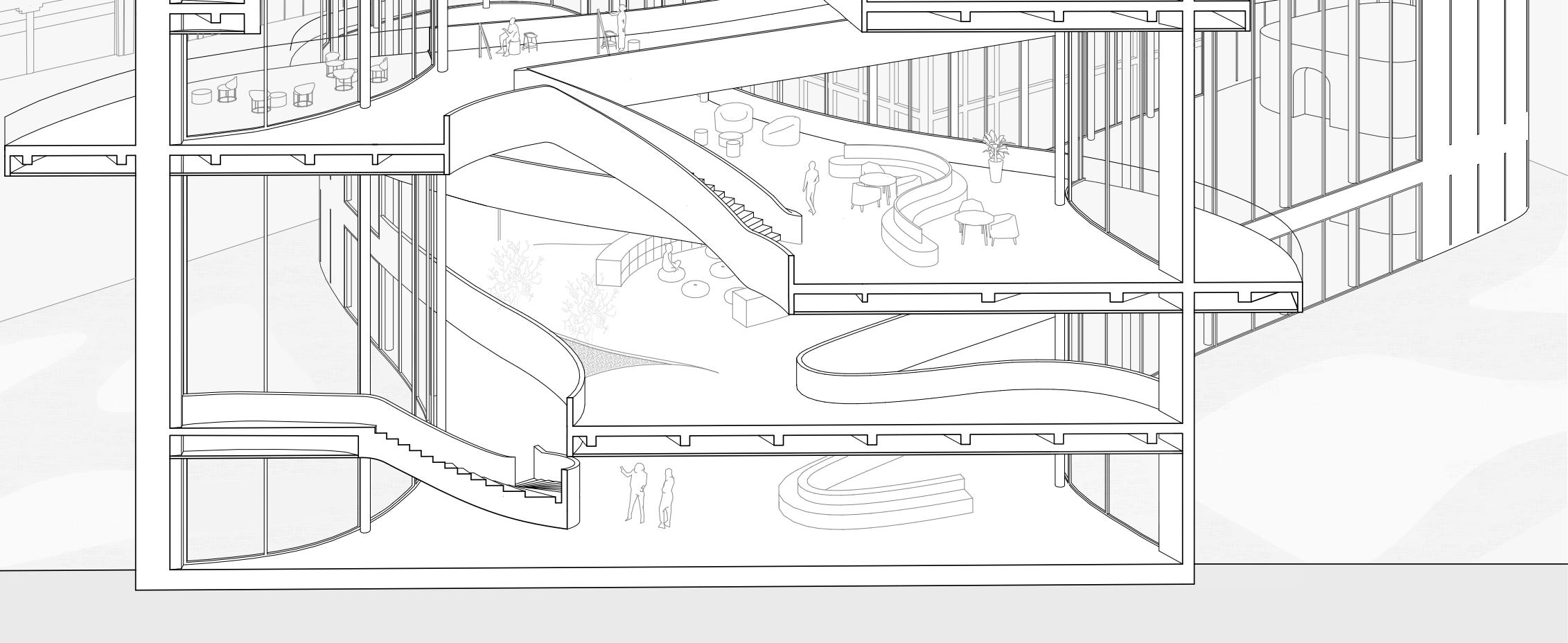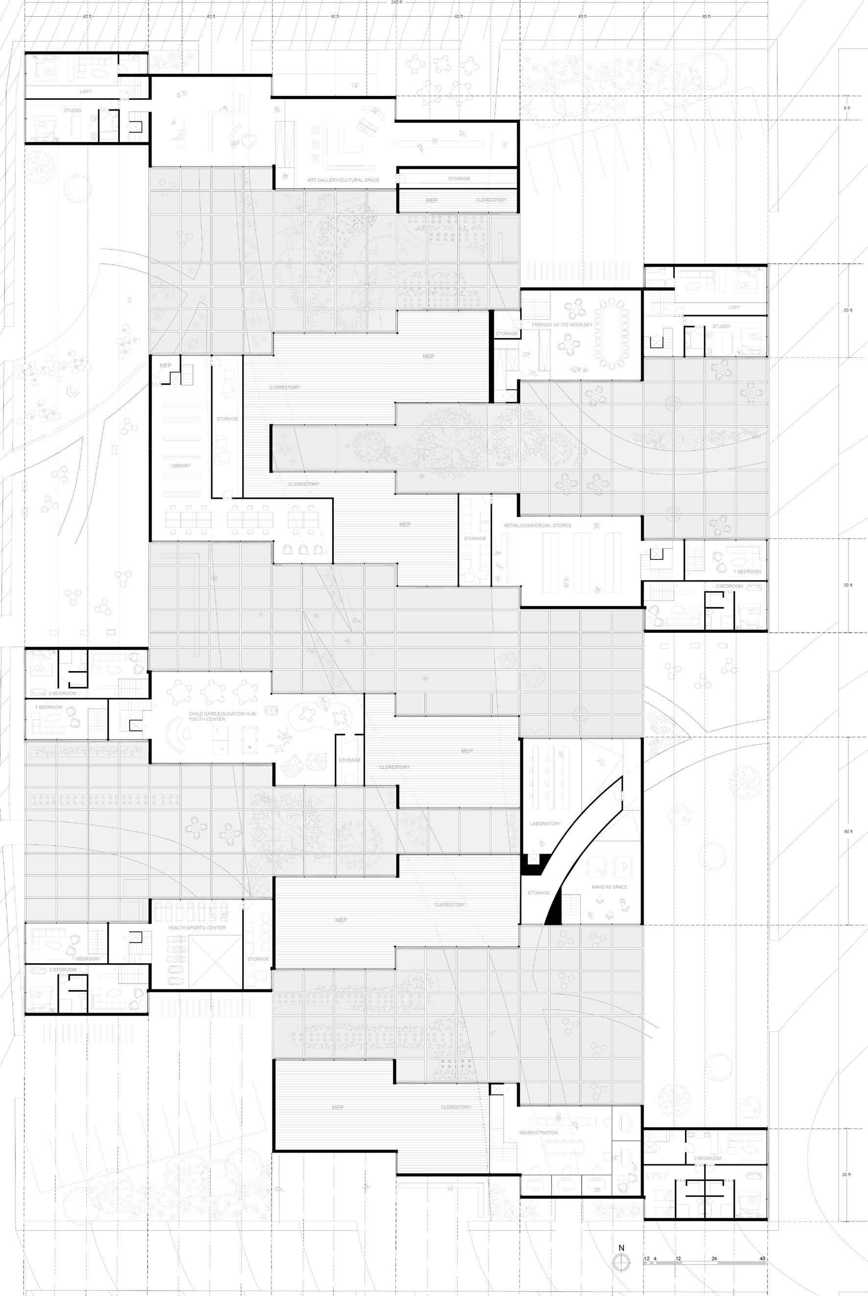 The primary recreational programs of dance, yoga, and art seamlessly intertwine within open floor plans, created by pushing columns and structural walls towards the perimeter. The building's curved design mirrors the unrestrained nature of the programs it hosts, inviting the liberty of expression in a diverse community.