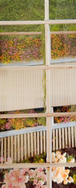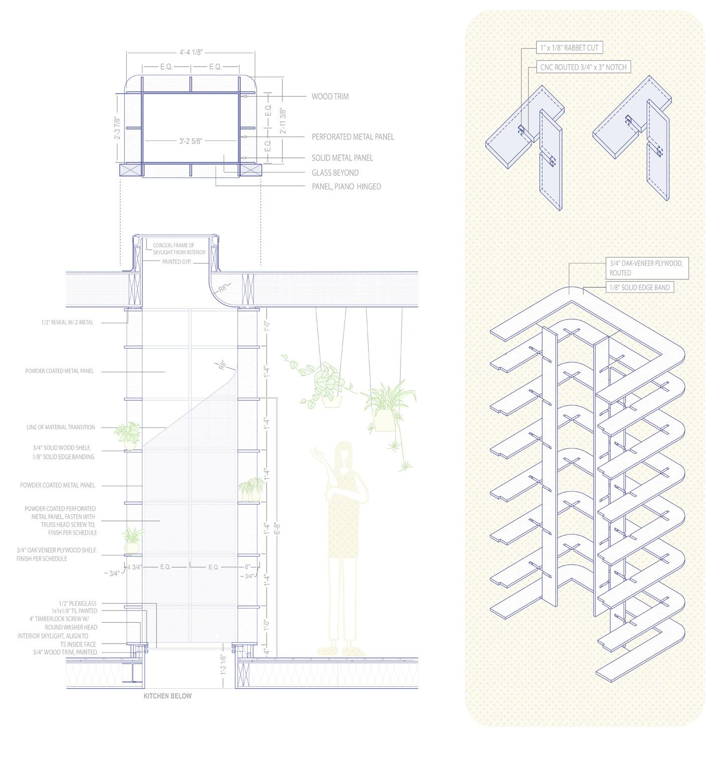 Textured glass blocks rest inside a blue metal frame that lets the green and light bleed to the outside while miantaining mystery. The transparency of the perimeter highlights the darkness of the entrance. The narrow entryway naturally slows movement and focuses attention. As guests eyes adapt to the dim light, they are forced to rely on the textured walls to guide them forward. This passage opens into a circular wooden enclosure, circling around a single tree that grows beyond the ceiling. Here, attention shifts to smell; labeled slots invite customers to walk around and smell various herbs. After roaming the circular path, visitors enter a tunnel with framed views of the exterior garden that then opens up to the main shop. Now familiar with the aromas from the garden, they can make an informed choice from the menu. While waiting for their tea, customers are encouraged to explore the gardens or relax in sunken nooks. The open-ceiling gardens on both ends provide natural indirect light to the main shop. Every wall inside the shop is covered in shelves that hold books, art, and warm lighting. Near the exit, a water feature cools the area passively, adding a soothing, auditory backdrop. As customers make their way out, the sound intensifies, and once past the exit, the exterior now seems quieter.