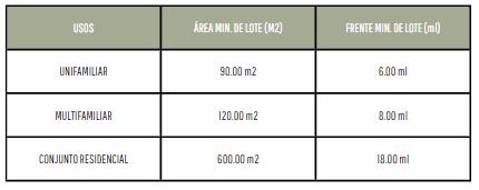 RESIDENCIAL RDM Este lugar se caracteriza por la abundancia de domicilios USOS PERMITIDOS: Unifamiliar, Multifamiliar y conjunto residencial USOS GENÉRICOS: DIMENSIONES DE LOTE: Uso residencial y uso comercial Deberán planearse lo recomendado a continuación. Deberán plantearse al porcentaje que se observará en el siguiente cuadro COEFICIENTE DE EDIFICACIÓN: Es importante conocer esta información por ende, se indica en lo siguiente: RETIRO MINIMO: Estará contemplado en el certificado de alineamiento ÁREA LIBRE: