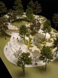 a con el atrio, se puede observar con detalle líneas sinuosas , están vendrían siendo desniveles ue otorgarán al espacio dinamismo en el recorrido " un reto para poder llegar a la guarida del se colocará mobiliario que represente las hojas del árbol para un ambiente " con esencia de bosque"